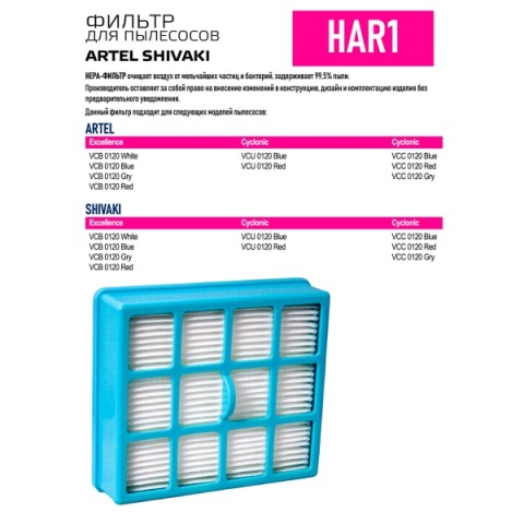 • Совместимость:для пылесосов Artel, Shivaki