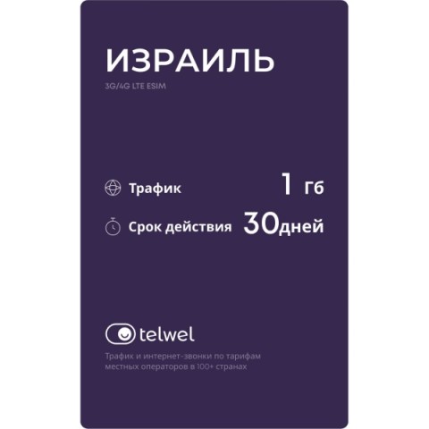 • Тарифный план:Израиль, 1Гб|30 дней. Для eSIM телефонов