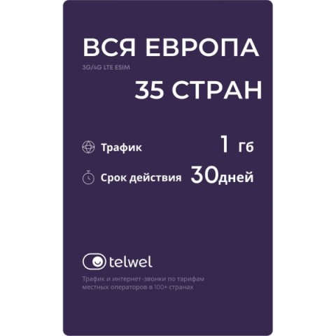 • Тарифный план:Вся Европа 35 стран, 1Гб 30 дней