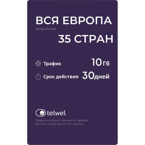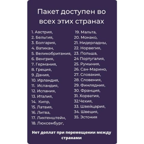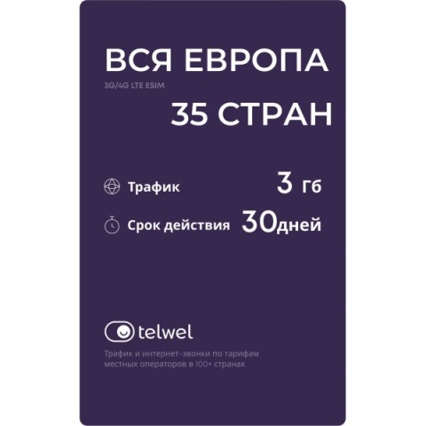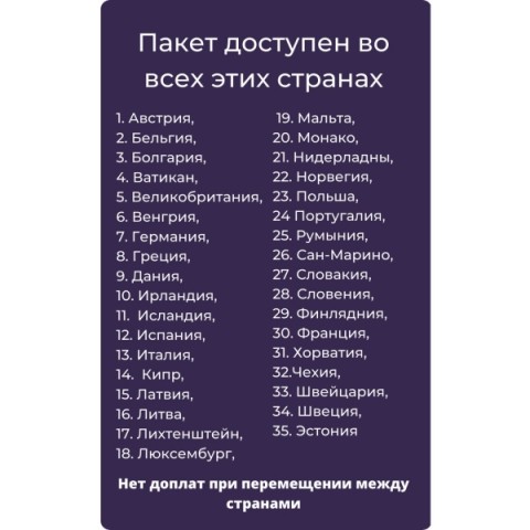 • Тарифный план:Вся Европа 35 стран 3Гб 30 дней