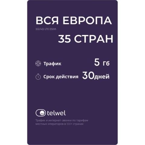 • Тарифный план:Вся Европа 35 стран 5Гб 30 дней