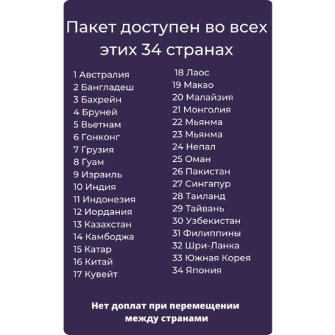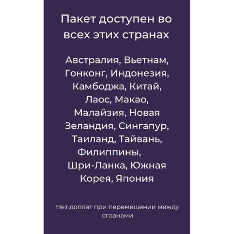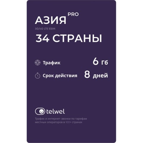 • Тарифный план:Азия PRO 34 страны, 6Гб|8 дней. Для eSIM телефонов