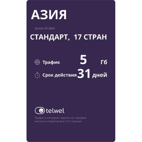 • Тарифный план:Азия Стандарт, 5Гб|31 день. Для eSIM телефонов