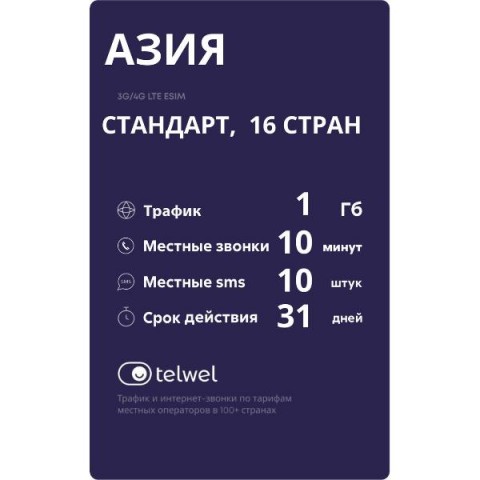 • Тарифный план:Азия Стандарт, 1Гб | 10минут | 10смс | 31 день. Для eSIM телефонов