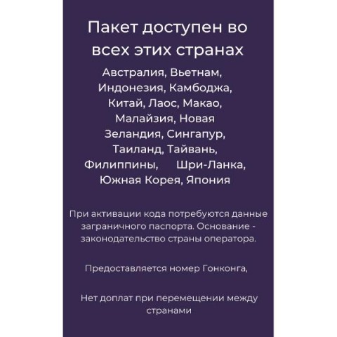 • Тарифный план:Азия PRO 34 страны, 6Гб|8 дней. Для eSIM телефонов