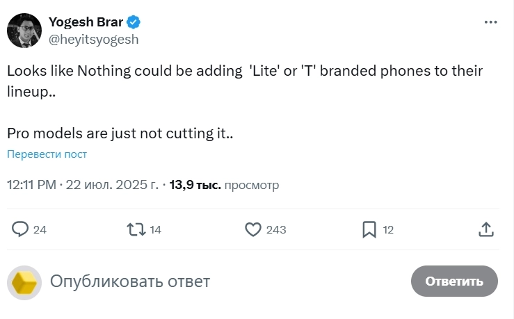 Заглянула в X и узнала, что инсайдер Йогеш Брар думает о планах компании Nothing. Йогеш пишет, что в каталоге Nothing могут появиться смартфоны, в названии которых будет приставка «Lite» или «T». Также гаджеты могут быть более доступными, чем линейка Phone (a). Расскажу подробнее.