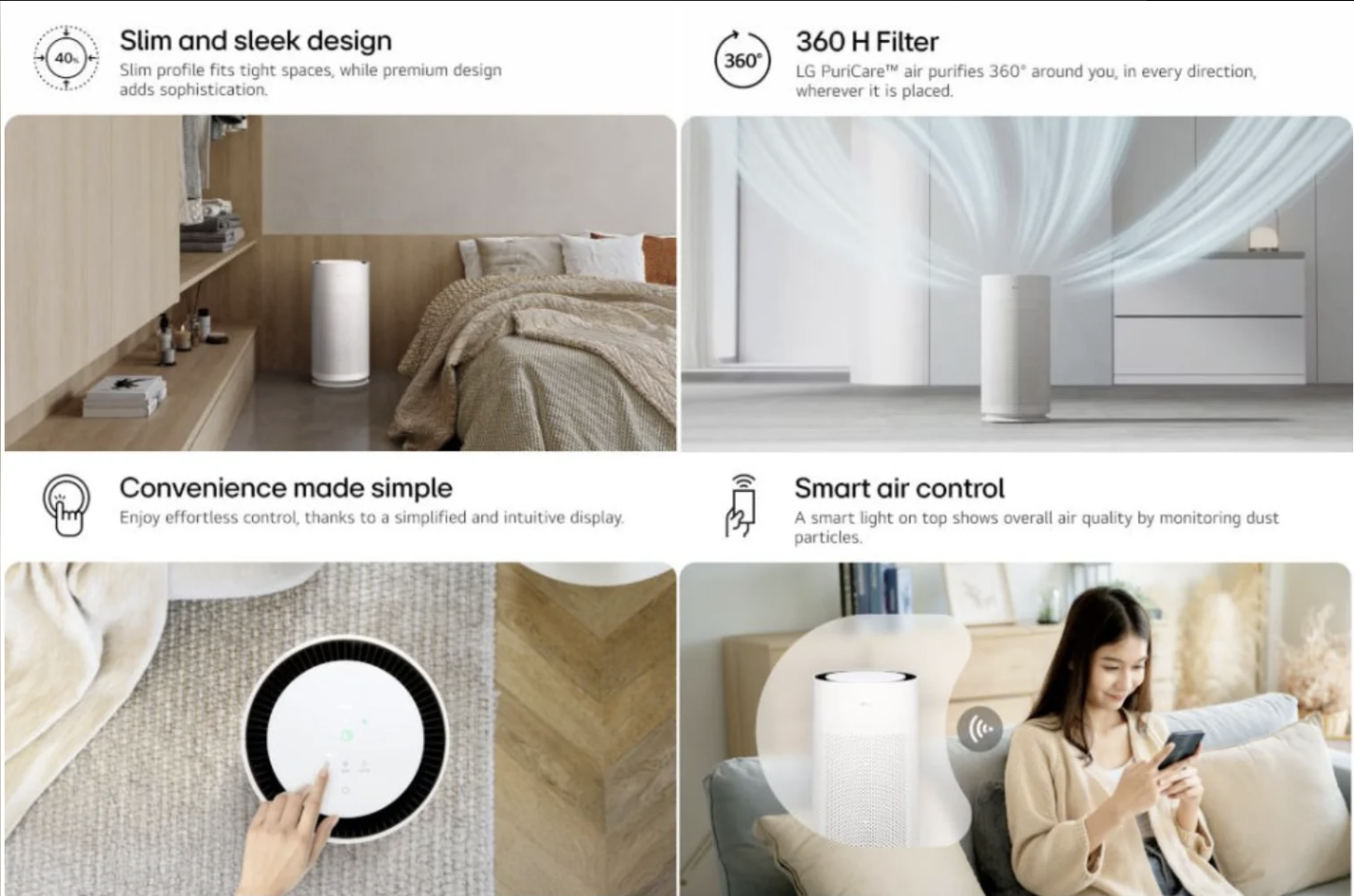 За очищение воздуха отвечает фильтр серии Aero Series H, представляющий собой многослойную систему, которая и поглощает всю пыль, аллергены, вирусы и неприятные ароматы. Благодаря датчику PM 1.0 очиститель воздуха способен обнаружить даже мельчайшие пылевые частицы — до 0,01 микрометра.