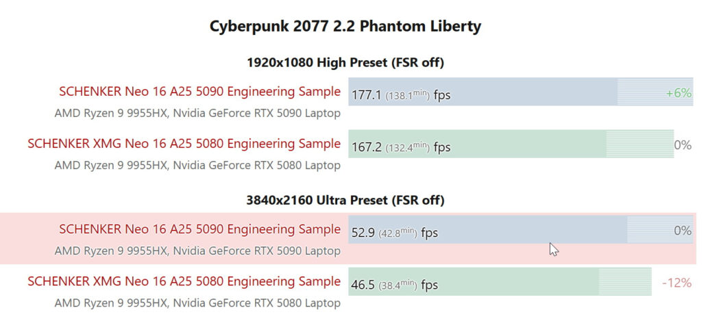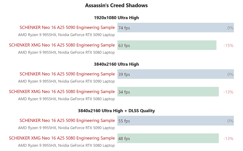 Несмотря на то, что у мобильной RTX 5090 больше ядер CUDA, чем у мобильной RTX 5080, показатель TDP у обеих моделей одинаковый — 150 Вт. Тесты Notebookcheck показали, что в играх RTX 5080 всего на 10−15% медленнее RTX 5090.