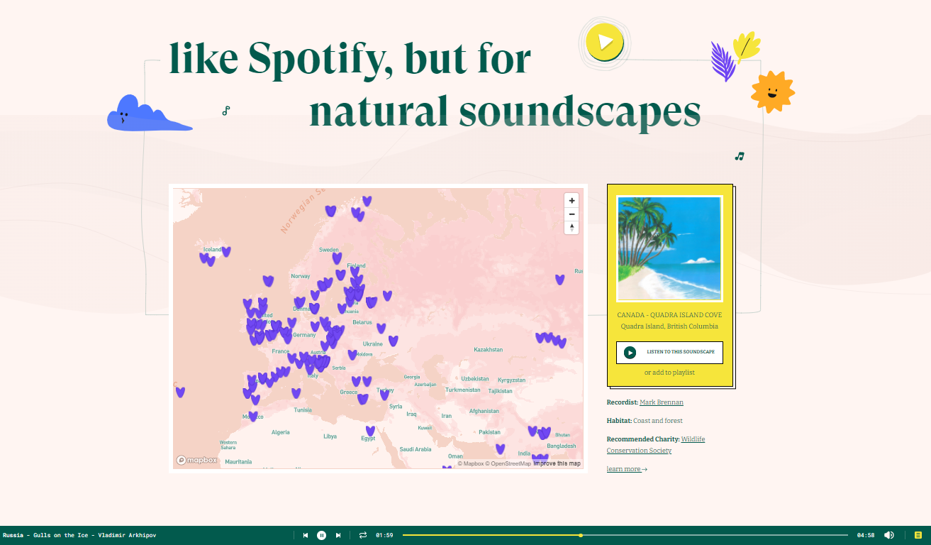 Речь о Земле и о звуках природы на всех шести ее континентах и некоторых островах. Сайт называется Earth.fm, создатели называют его «спотифаем для звуковых ландшафтов».