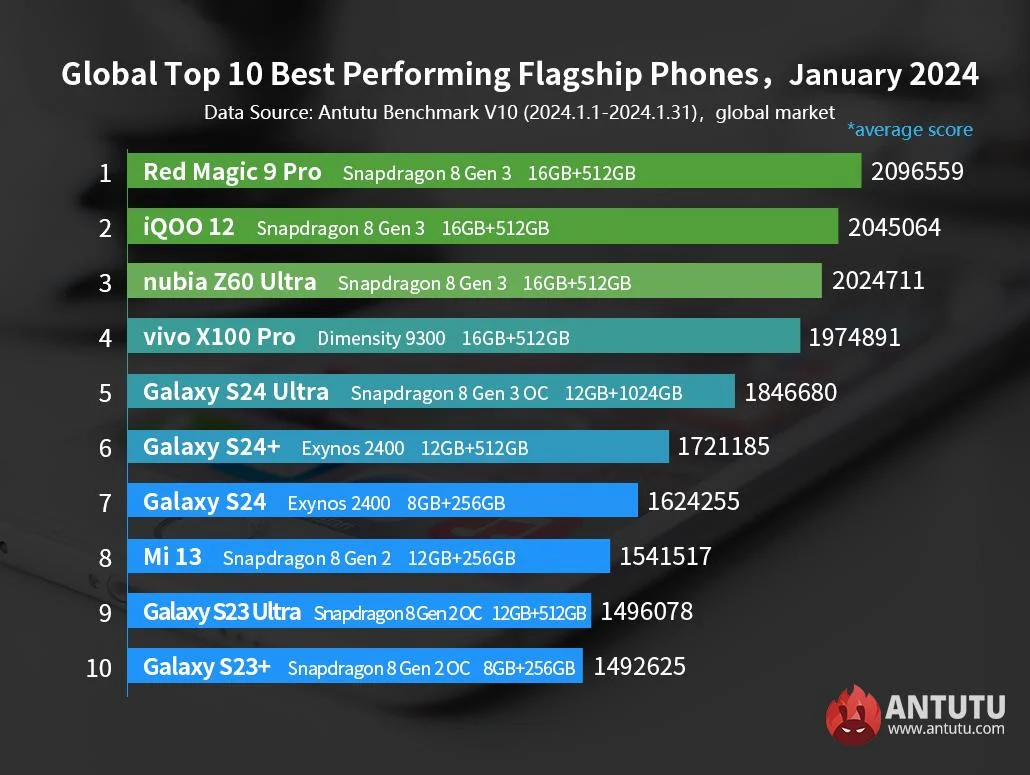 Здесь лидер рейтинга сменился. Если в декабре первое место занимал iQOO 12, то в январе лидером стал Red Magic 9 Pro. Кстати, это первый смартфон, у которого камеры не выпуклые. В этот раз iQOO 12 занял второе место, а третья строчка досталась nubia Z60 Ultra. Кстати, у всех этих смартфонов процессор Snapdragon 8 Gen 3.