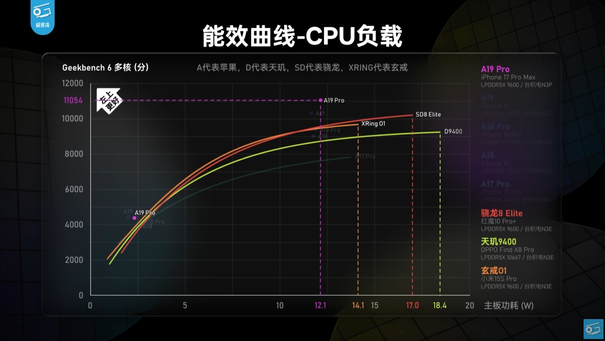 Помимо батареи внимание привлек и новый процессор A19 Pro, который установлен в iPhone 17 Pro и 17 Pro Max. Тесты Geekbench 6 показали, что это самый мощный мобильный чип на рынке, обгоняющий все Android-флагманы не только в производительности, но и в энергоэффективности. При многоядерной нагрузке A19 Pro потребляет всего 12,1 Вт — на 30% меньше, чем Snapdragon 8 Elite, и на треть меньше, чем Dimensity 9400, при этом показывая лучшие результаты.