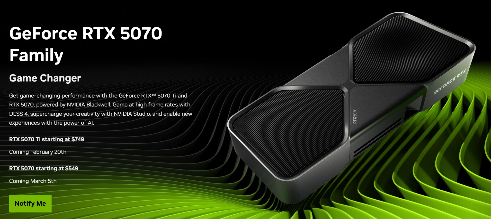 Изначально выпуск GeForce RTX 5070 планировался в феврале, но на официальном сайте NVIDIA информация изменилась, и теперь релиз новинки запланирован на 5 марта. В то же время для GeForce RTX 5070 Ti по-прежнему стоит дата 20 февраля.
