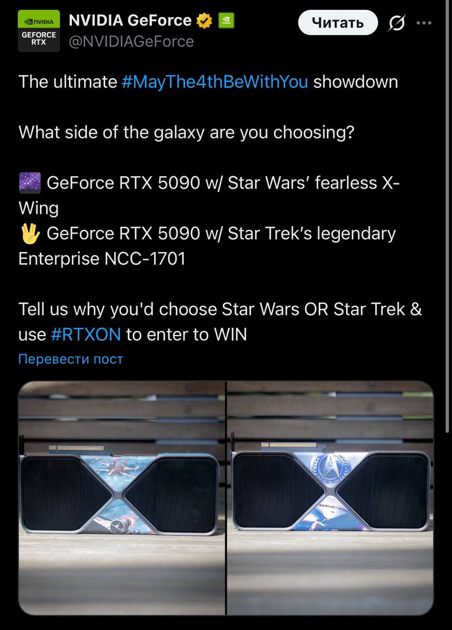 NVIDIA весьма оригинально представила две эксклюзивные модели GeForce RTX 5090 Founders Edition, стилизованные под космические корабли X-Wing из «Звездных войн» и Enterprise NCC-1701 из «Звездного пути». В сети 𝕏 компания запустила розыгрыш в честь дня «Звездных войн».