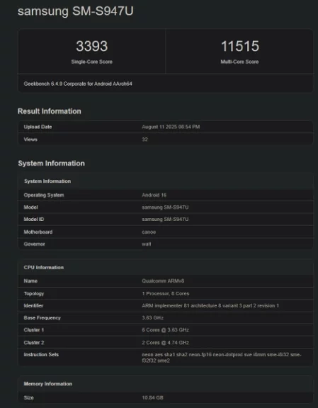 Новый процессор тестировали на смартфоне Samsung под кодовым названием SM-S947U. Чип набрал в одноядерном режиме 3393 балла, а в многоядерном — 11 515 баллов. Показатели у новинки лучше, чем у предшественника. Тогда было 3125 и 9932 баллов соответственно.