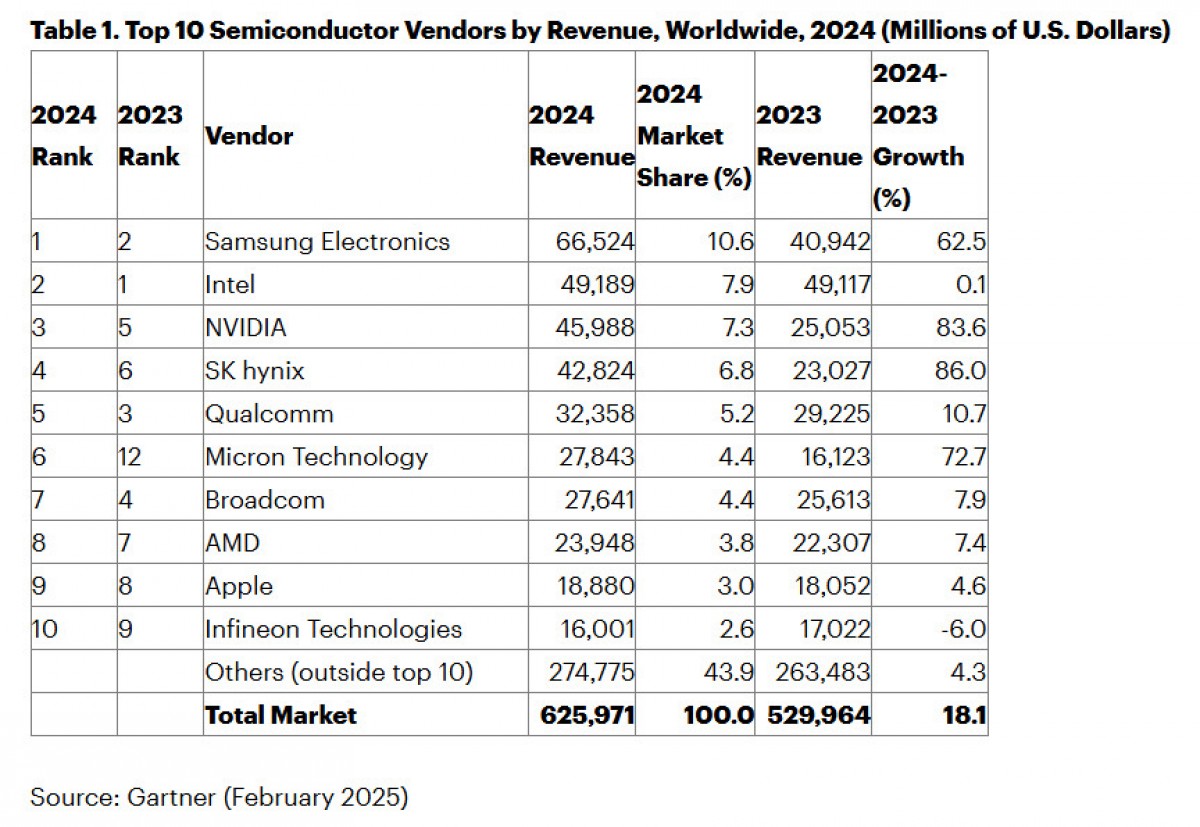Американская консалтинговая компания Gartner составила рейтинг 10 крупнейших поставщиков чипов. Рассказываю, кто в топе.
