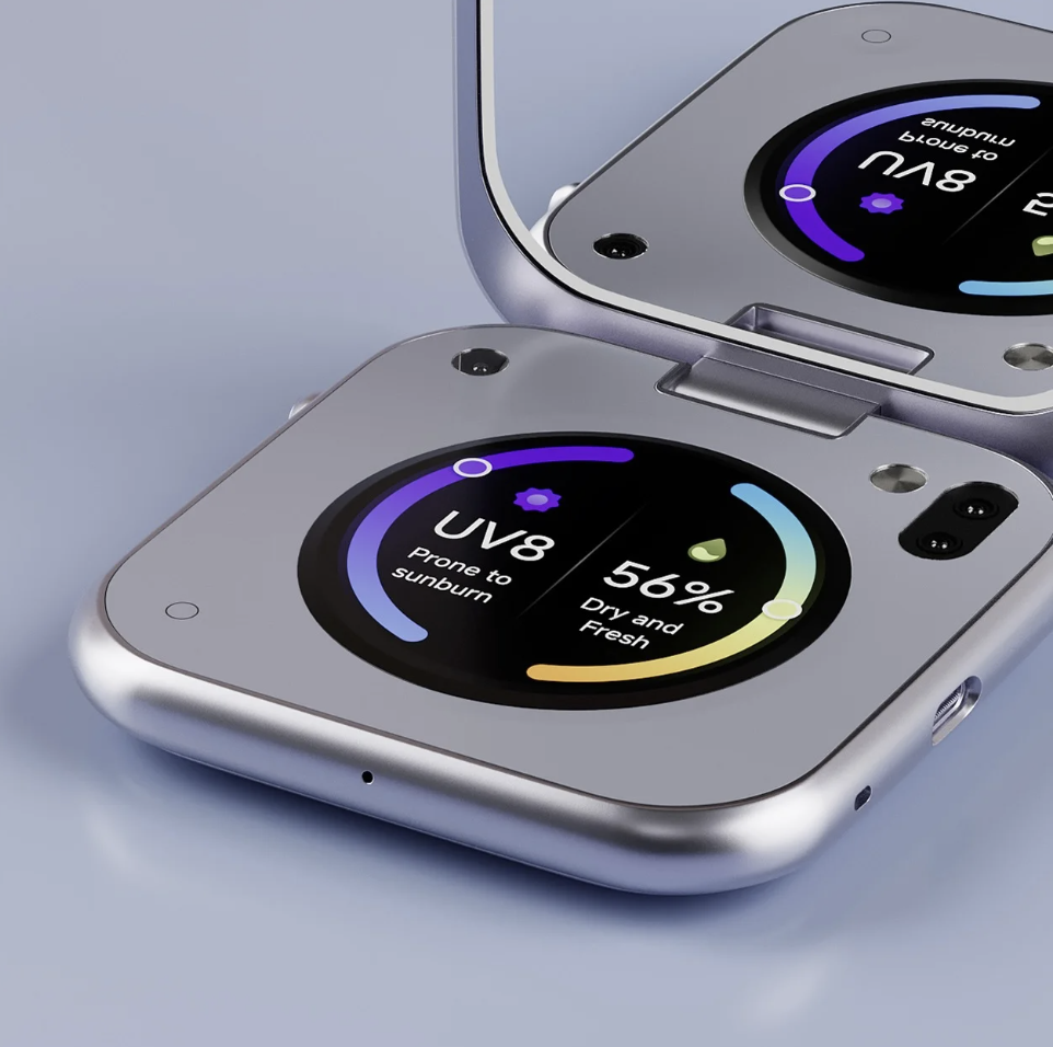 В верхней части находится само зеркало с настраиваемой подсветкой (холодной, теплой и нейтральной). В нижней части — 1,6-дюймовый сенсорный экран, на котором видна информация об уровне солнечного света и влажности. Встроенная УФ-камера анализирует равномерность нанесения SPF-крема. Три встроенные камеры оценивают увлажнение и здоровье кожи.