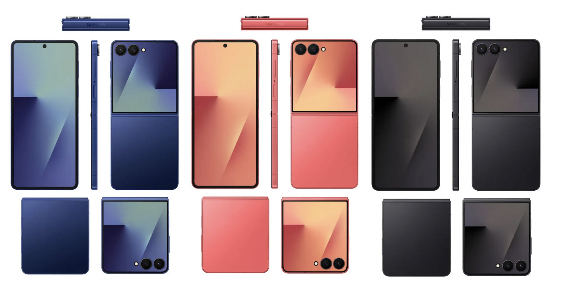 Инсайдер Эван Бласс опубликовал рендеры будущих новинок, раскрыв их цвета. так стало известно, что Galaxy Z Flip7 выйдет в трех расцветках: черном (Jet Black), синем (Blue Shadow) и красном (Coral Red).