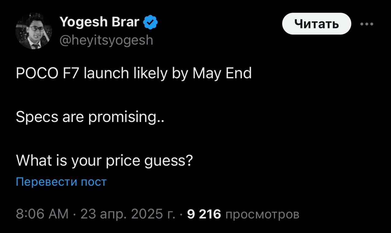 Инсайдер Йогеш Брар опубликовал в сети 𝕏 пост, где сказано, что F7, скорее всего, выйдет к концу мая с «многообещающими характеристиками».