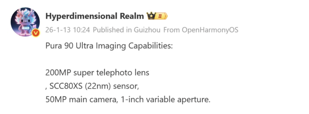 Информацией поделился инсайдер под ником Hyperdimensional Realm. Если верить ему, смартфон Pura 90 Ultra получит камеру с 200-мегапиксельным телеобъективом, благодаря чему снимки станут более четкими с зумом и при плохой освещенности.