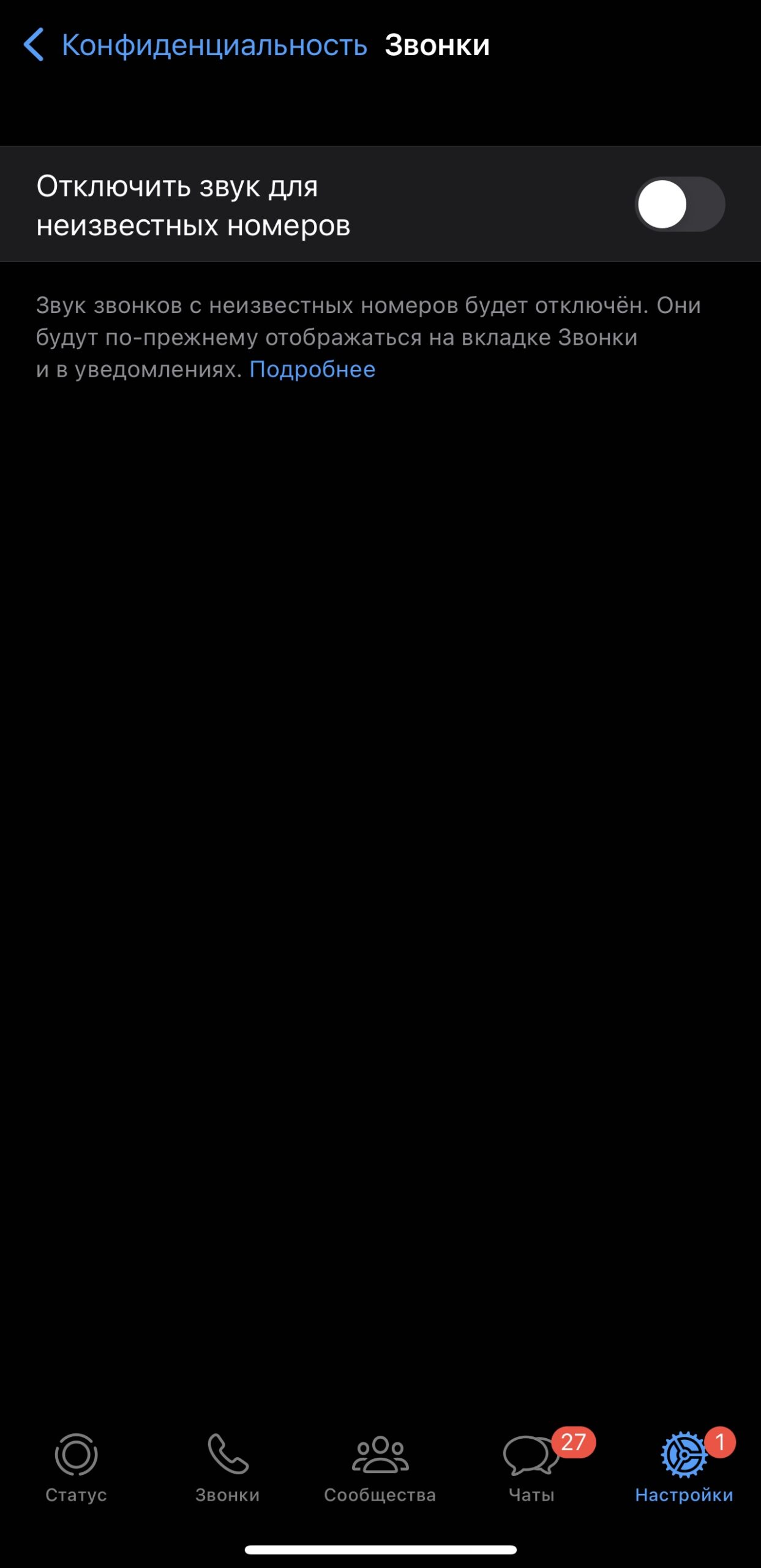 Отключение звука для неизвестных номеров — удобный инструмент для фильтрации спама и мошенников. При этом во вкладке «Звонки» и в уведомлениях история входящих отобразится, чтобы вы могли проверить, не пропустили ли что-то важное. Включить функцию можно так: «Настройки» → «Звонки» → «Отключить звук для неизвестных номеров».