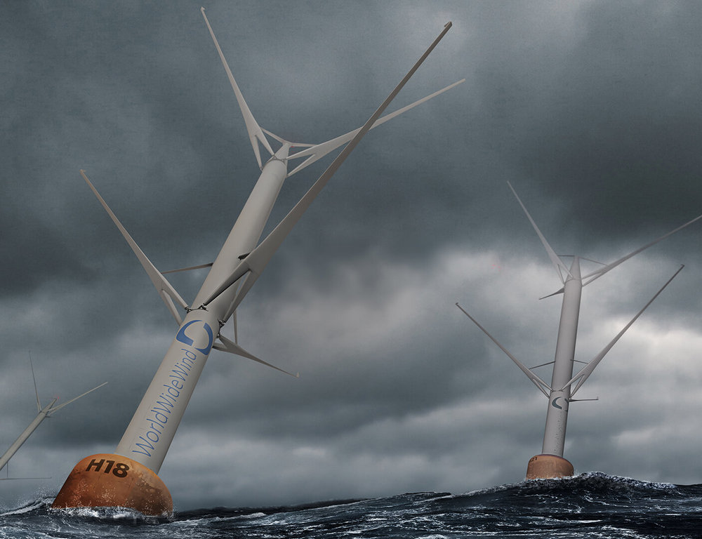 Как можно видеть по фото вверху, ветрогенераторы Hornsea 2 имеют привычную форму, или, как сказали бы инженеры, представляют собой установки с горизонтальной осью вращения. Недостаток такой конструкции состоит в том, что ее мощность зависит от длины лопастей, и ее невозможно использовать в море на больших глубинах далеко от берега из-за большого веса и неустойчивости (крайне трудно заглубить фундамент для опоры настолько, чтобы гигантский ветряк мог противостоять порывам ветра и ударам волн). Разрешить эти затруднения (и создавать морские ветропарки еще большей мощности) поможет разработка норвежской компании World Wide Wind. Речь идет о плавучей ветряной установке с вертикальной осью вращения.