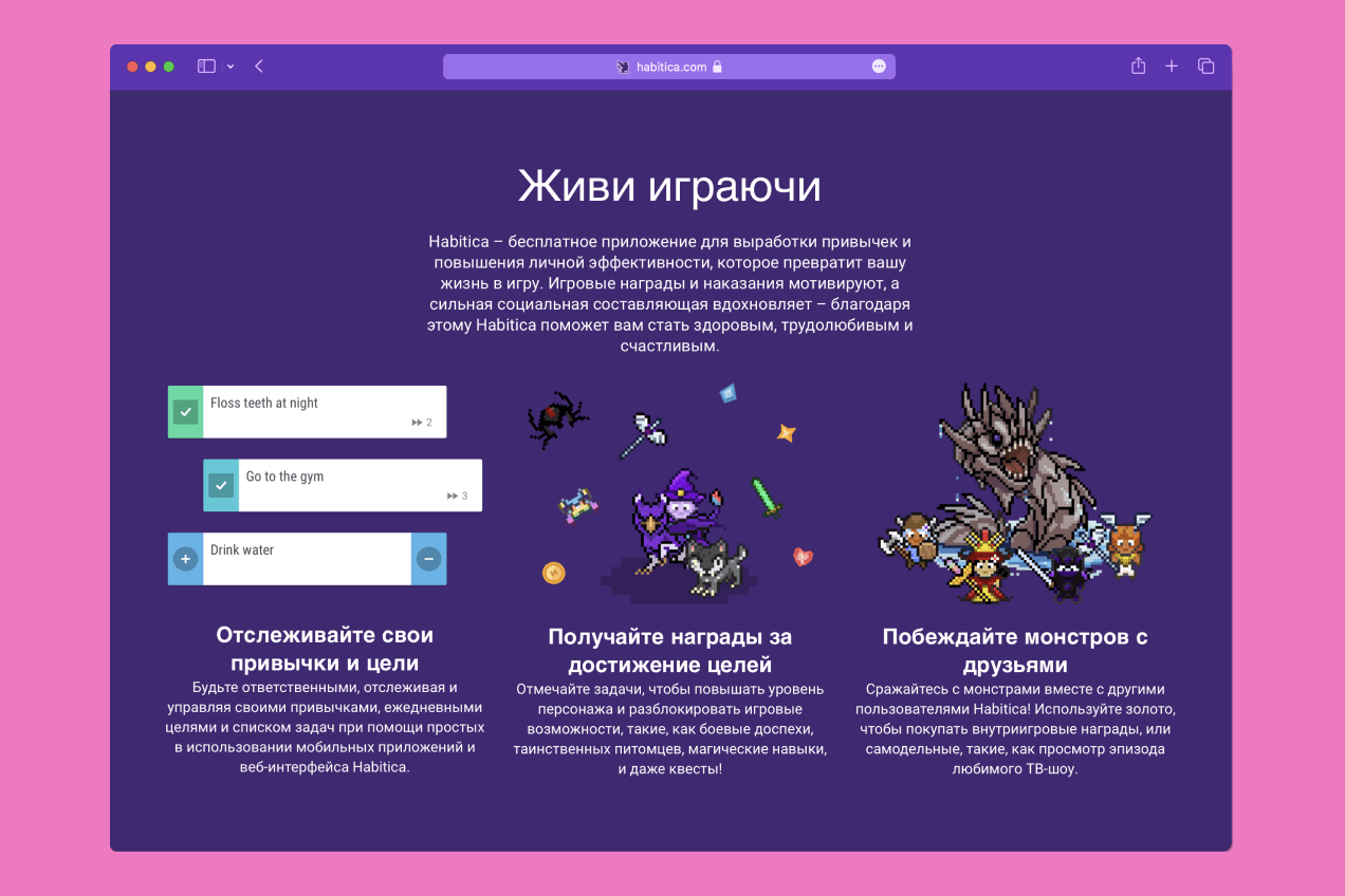 По своей сути Habitica представляет собой обычный планировщик задач, но с одним важным дополнением — геймификацией. Все в сервисе построено на RPG-системе. Пользователь создает себе персонажа, который будет прокачиваться по мере выполнения задач и обязательств. То есть, если вы продержались неделю без сладкого и выполнили несколько рабочих задач — получаете опыт и прокачиваете уровень, если сорвались — теряете жизнь. Все как в любой RPG-игре.
