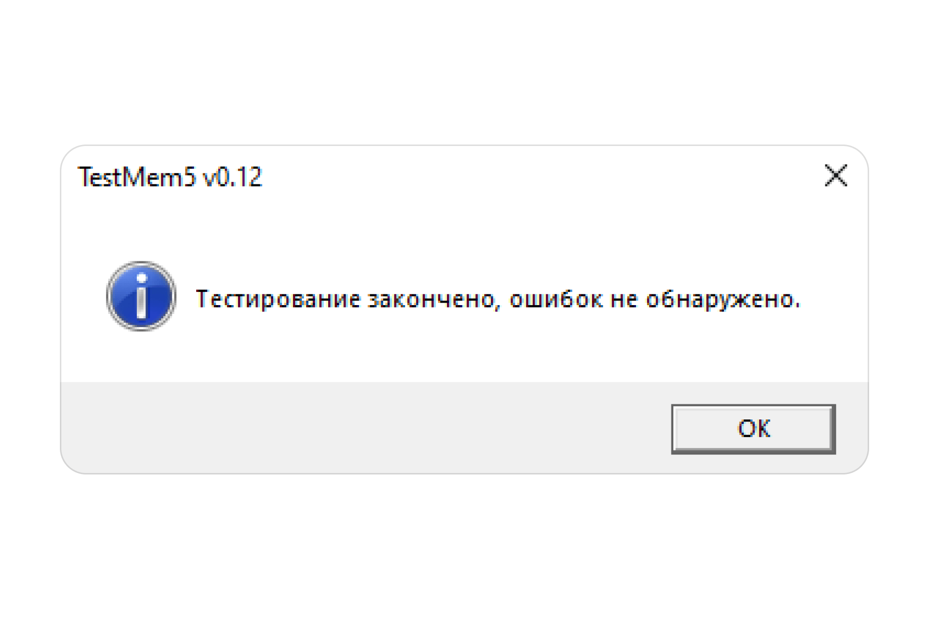 Некорректная работа памяти может приводить к процессорным ошибкам, поэтому ей следует уделить особое внимание. Для этого понадобится TestMem5. В архиве с программой находим исполняемый файл TM5.exe, запускаем его от имени администратора (для этого щелкаем по нему правой кнопкой мыши и выбираем соответствующий пункт в меню) и ждем завершения тестирования. В случае успеха TM5 рапортует об отсутствии неполадок.