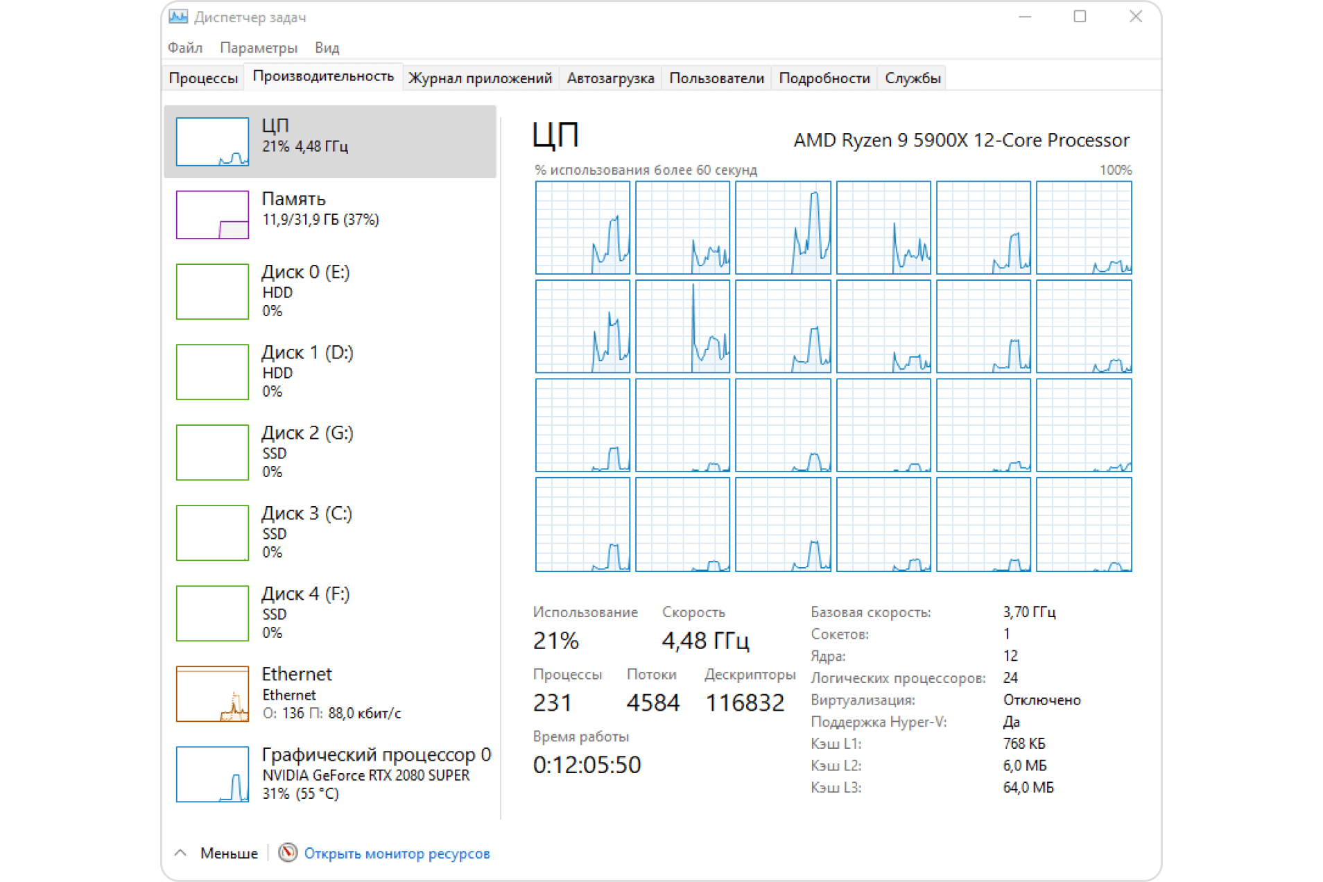 При этом отмечаем, что в нашем примере в ПК установлена NVIDIA GeForce RTX 2080 Super и мощный процессор AMD Ryzen 9 5900X с 12 ядрами, 24 потоками и частотой 4,9 ГГц. С видеокартой мощнее, к примеру, NVIDIA GeForce RTX 4090, процент загрузки ГП был бы еще ниже. Но как это возможно, если наш центральный процессор «отдыхает» и загружен всего на 21%?