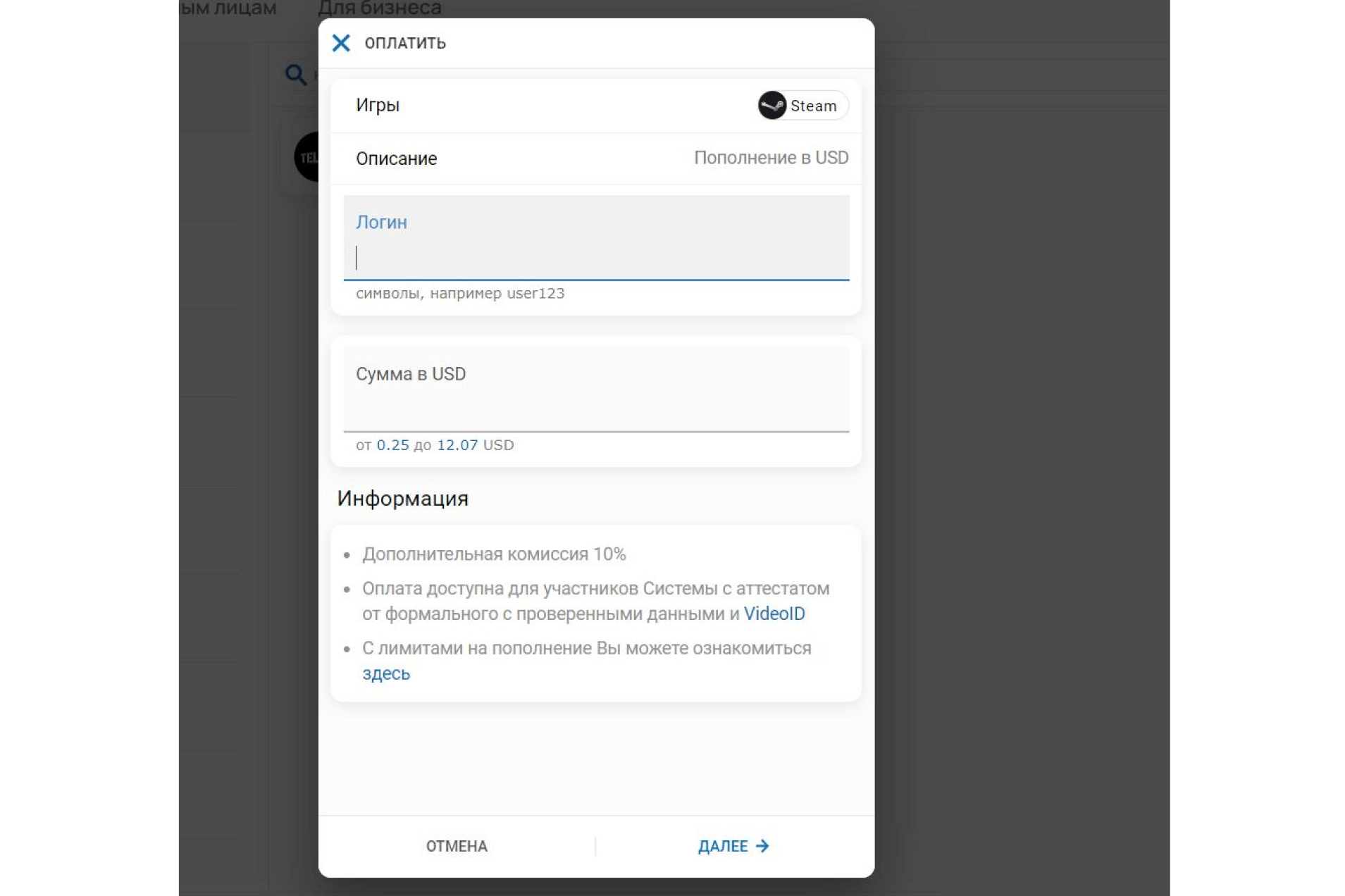 - Затем в меню кошелька найдите раздел «Платежи», в нем — «Игры» и «Steam пополнение в USD». После заполнения полей «Логин» и «Сумма платежа» деньги зачислятся на ваш Steam-аккаунт.