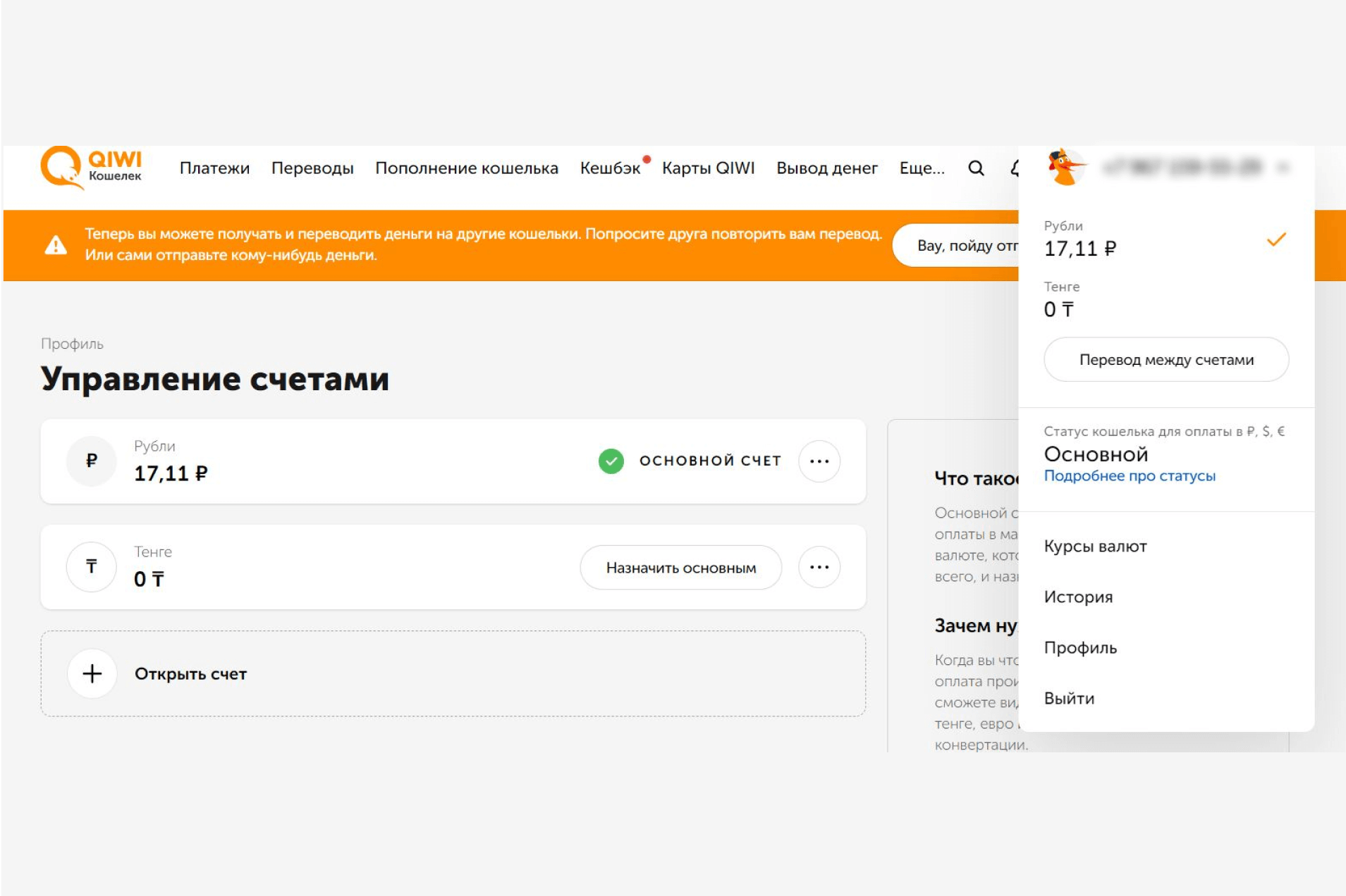 - В профиле нажмите на «Открыть новый счет» и в качестве валюты выберите тенге, сделайте этот счет основным с помощью соответствующей кнопки. Статус кошелька в тенге так и останется минимальным, это нормально.