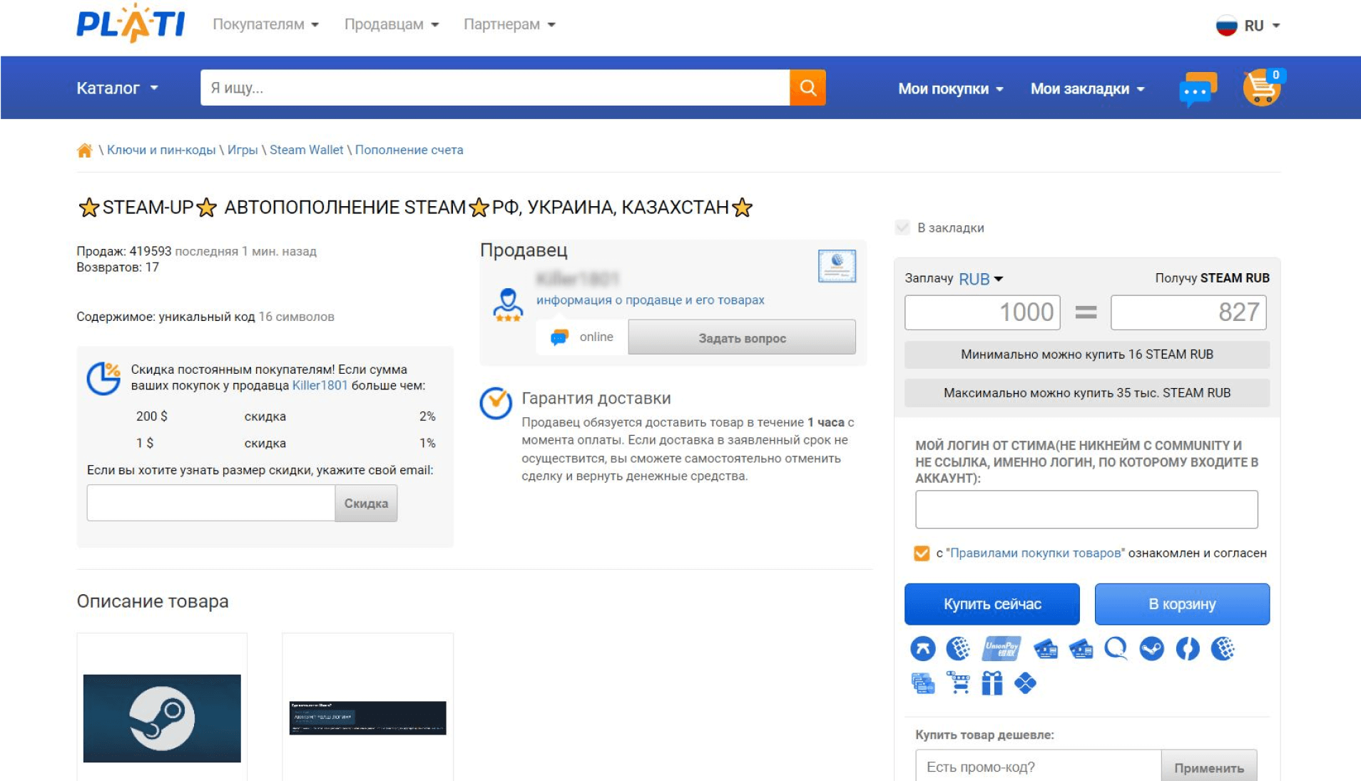 - Комиссия в таких сервисах отличается у разных продавцов, вы можете потратить некоторое время и выбрать тот вариант, который наиболее выгоден. Для написания этой статьи мы протестировали услугу по пополнению баланса стим одного из топовых продавцов сервиса Plati