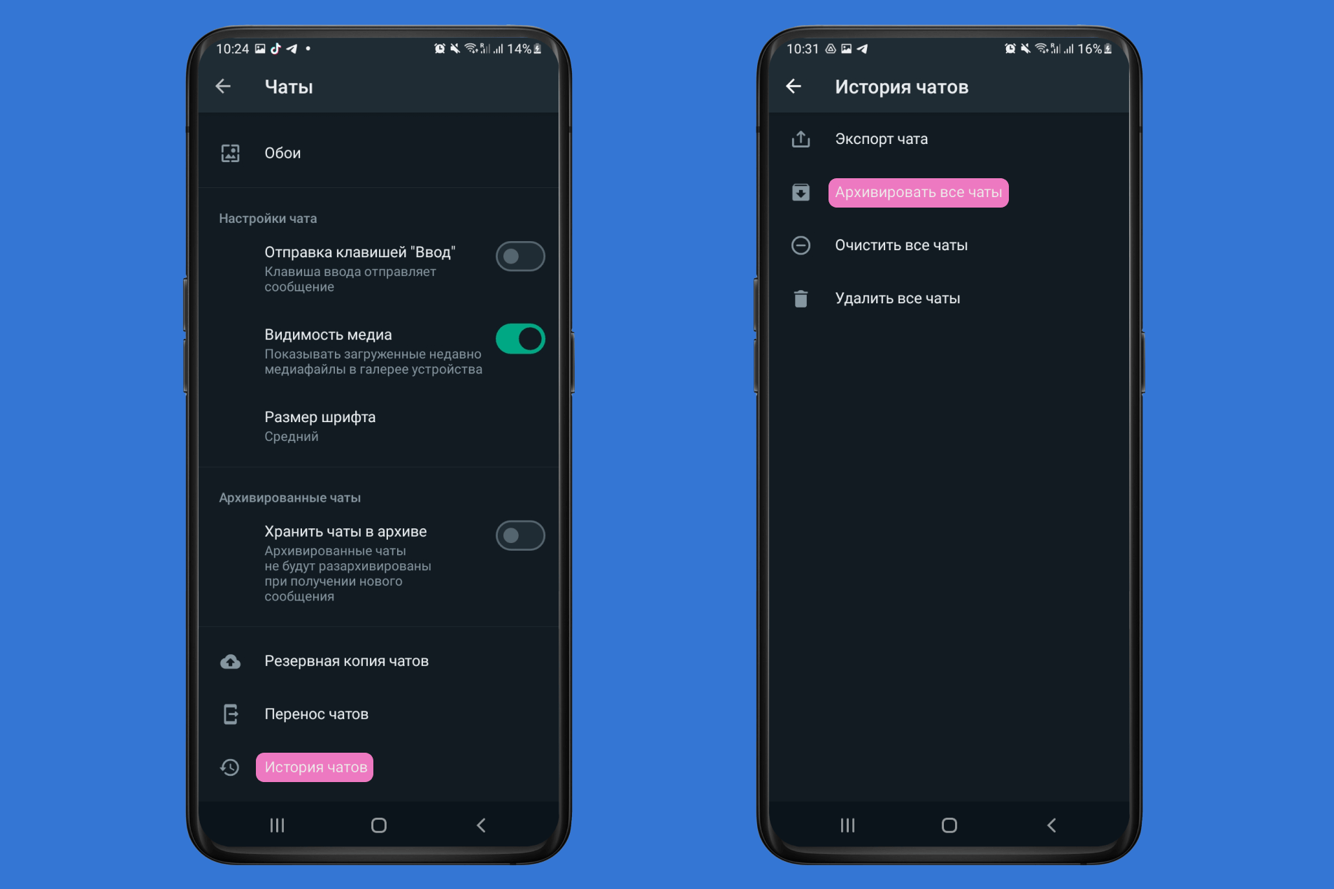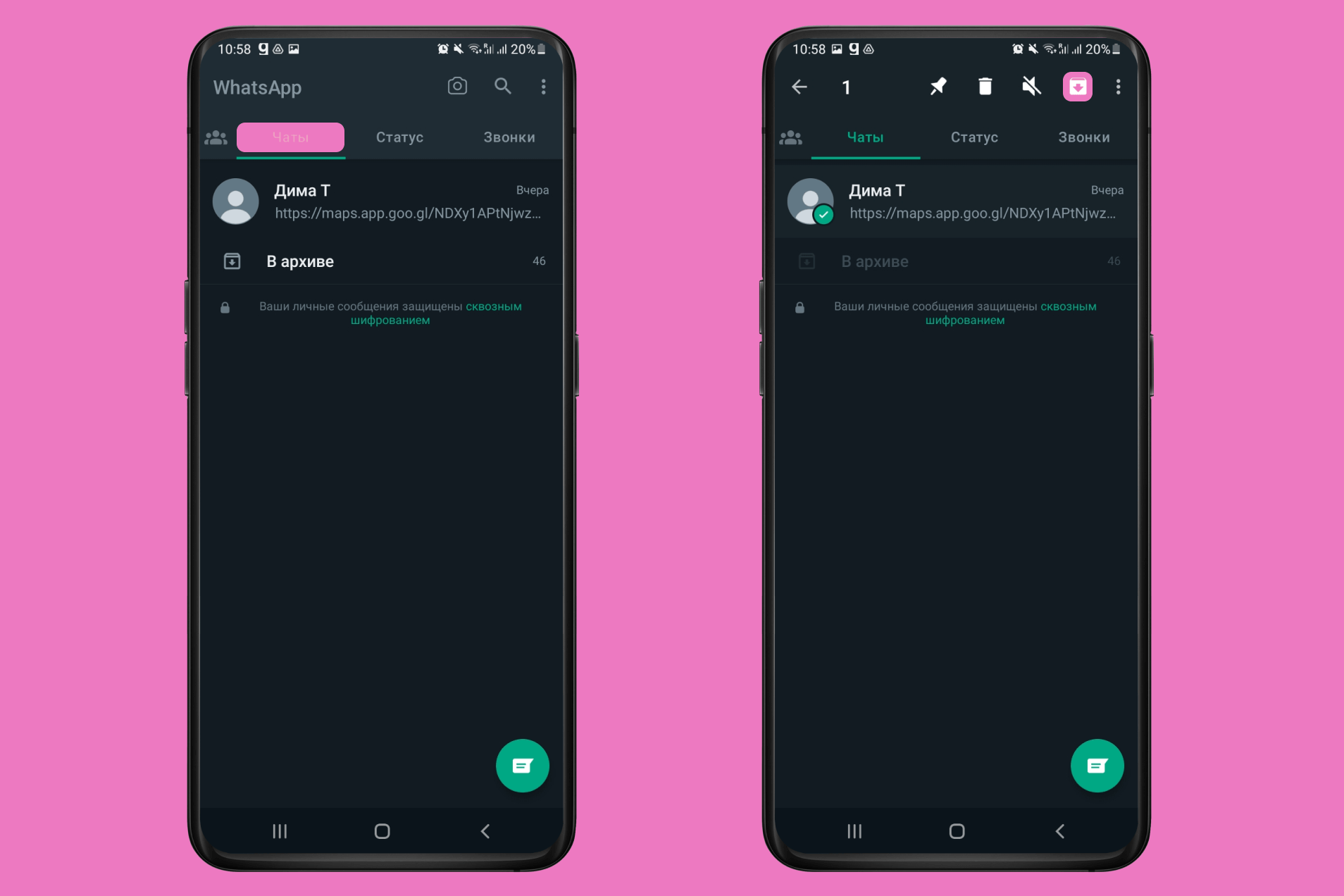 Вы можете архивировать как один отдельный чат, так и переписку со всеми контактами, которые есть в мессенджере.