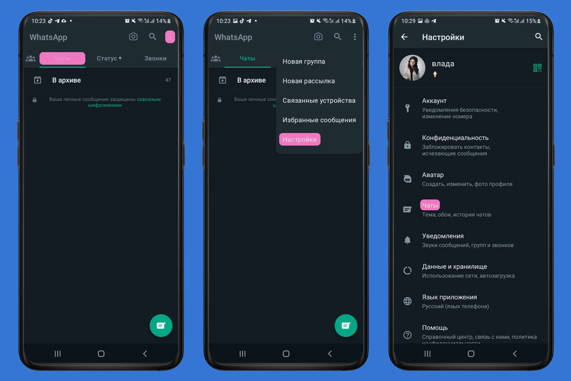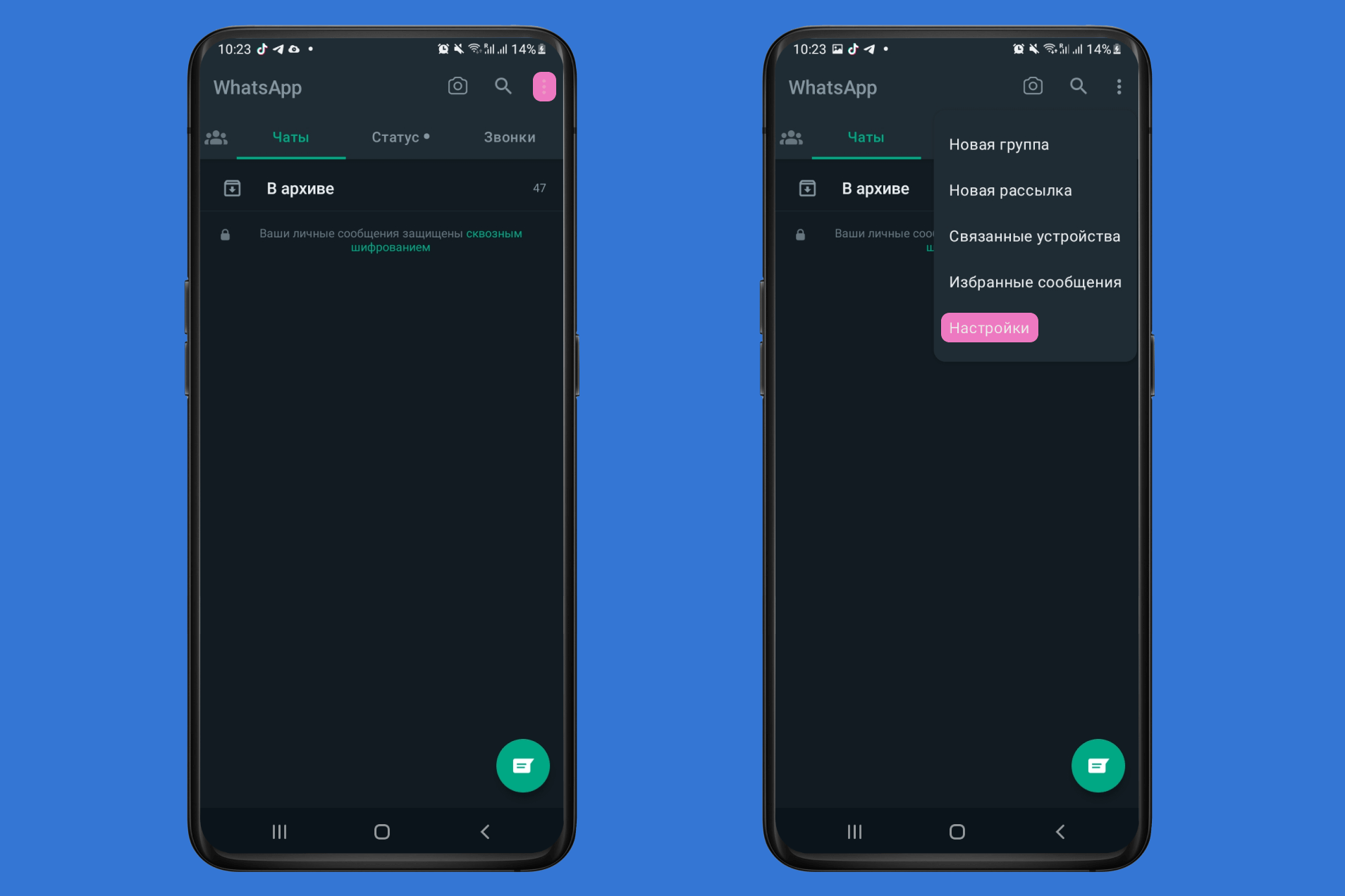 Если вы пользуетесь смартфоном с платформой Android и хотите скрыть все чаты в WhatsApp, повторяйте шаг за шагом.