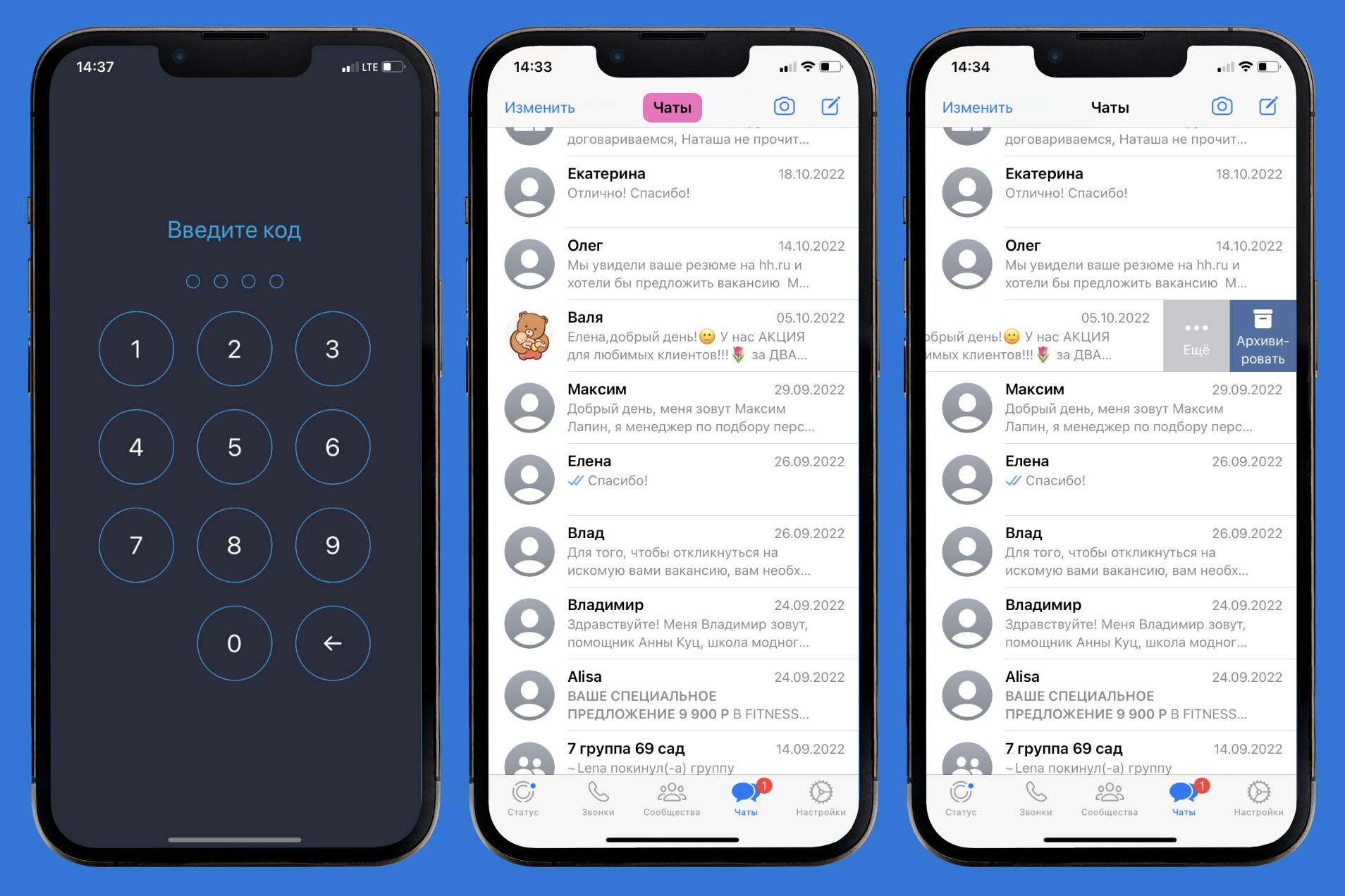 - Для блокировки приложения установите 4-значный PIN-код. После его установки для входа в мессенджер необходимо будет каждый раз вводить пароль.