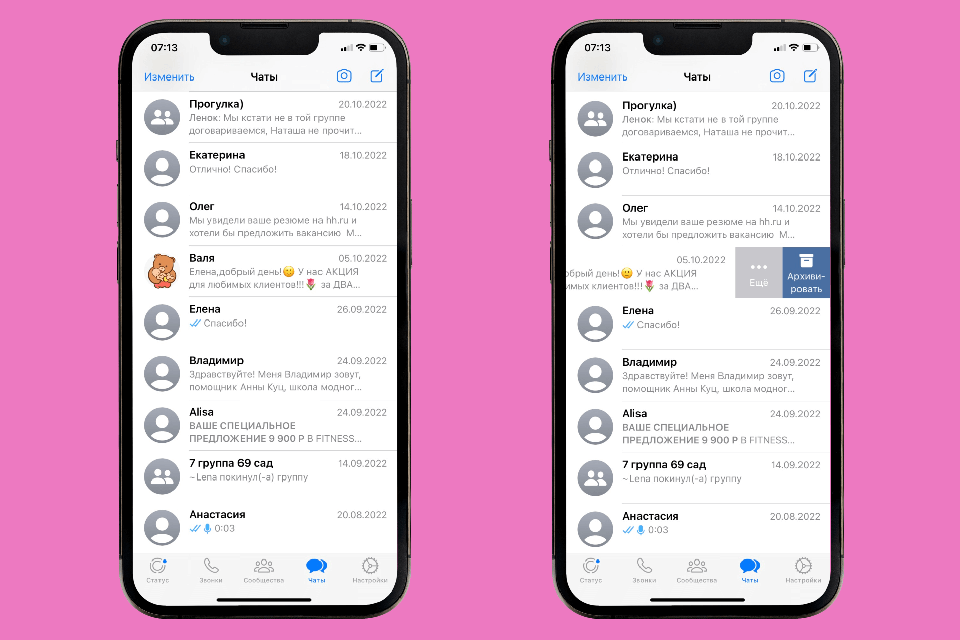 Чтобы скрыть одну или несколько бесед от посторонних глаз, их можно убрать в раздел «Архив».