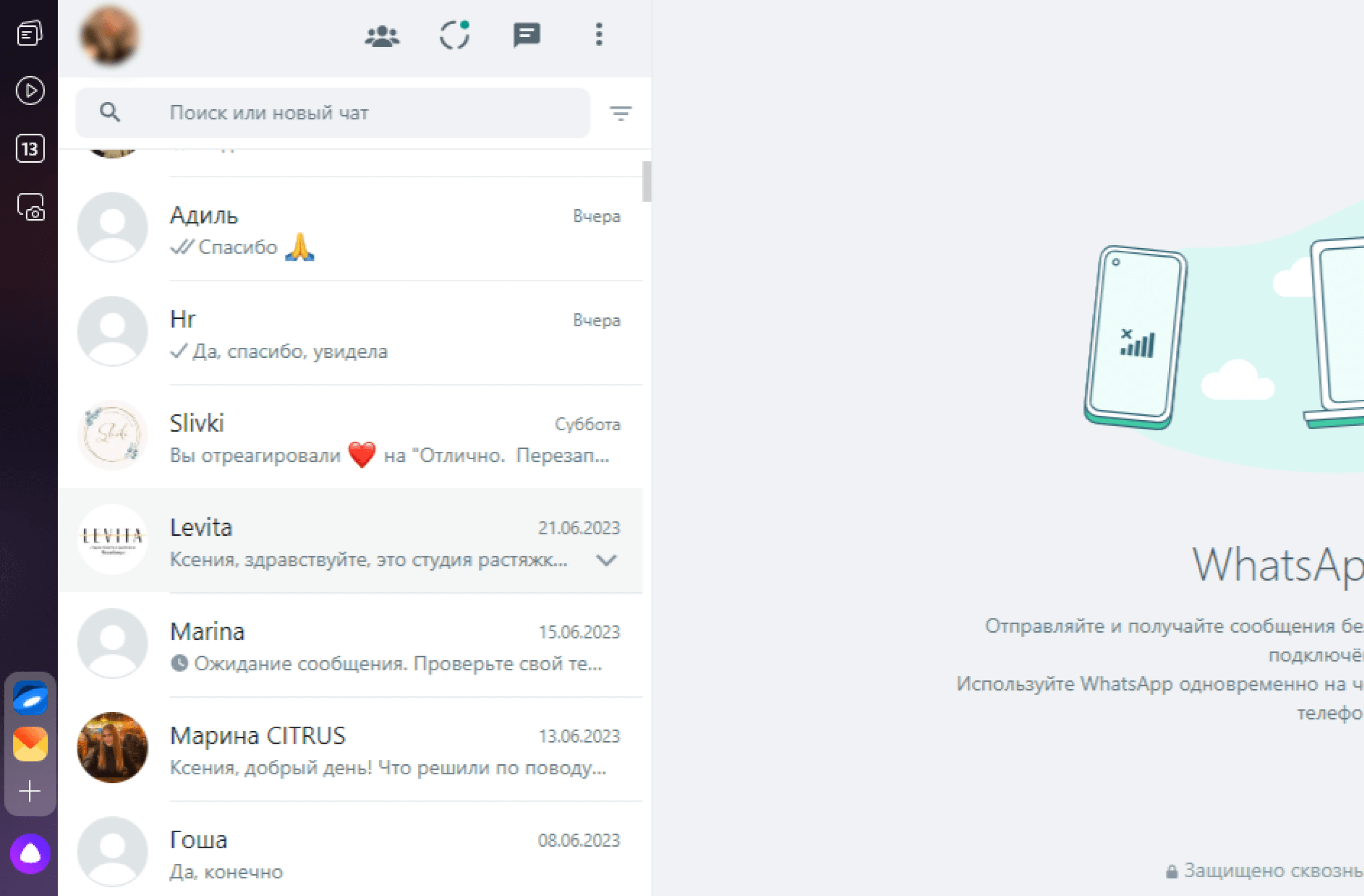 Скрыть переписку можно и в web-версии мессенджера. Для этого необходимо: