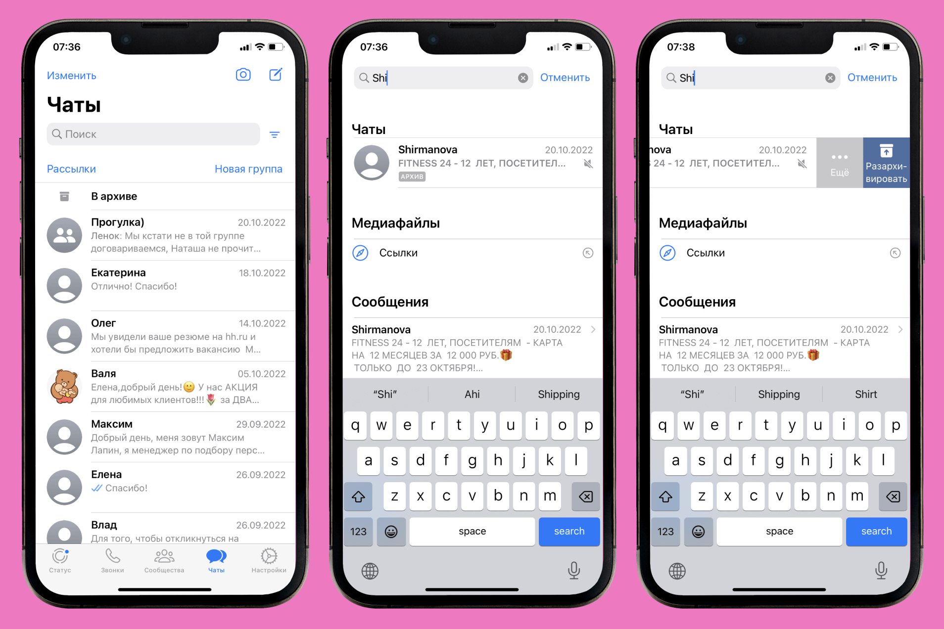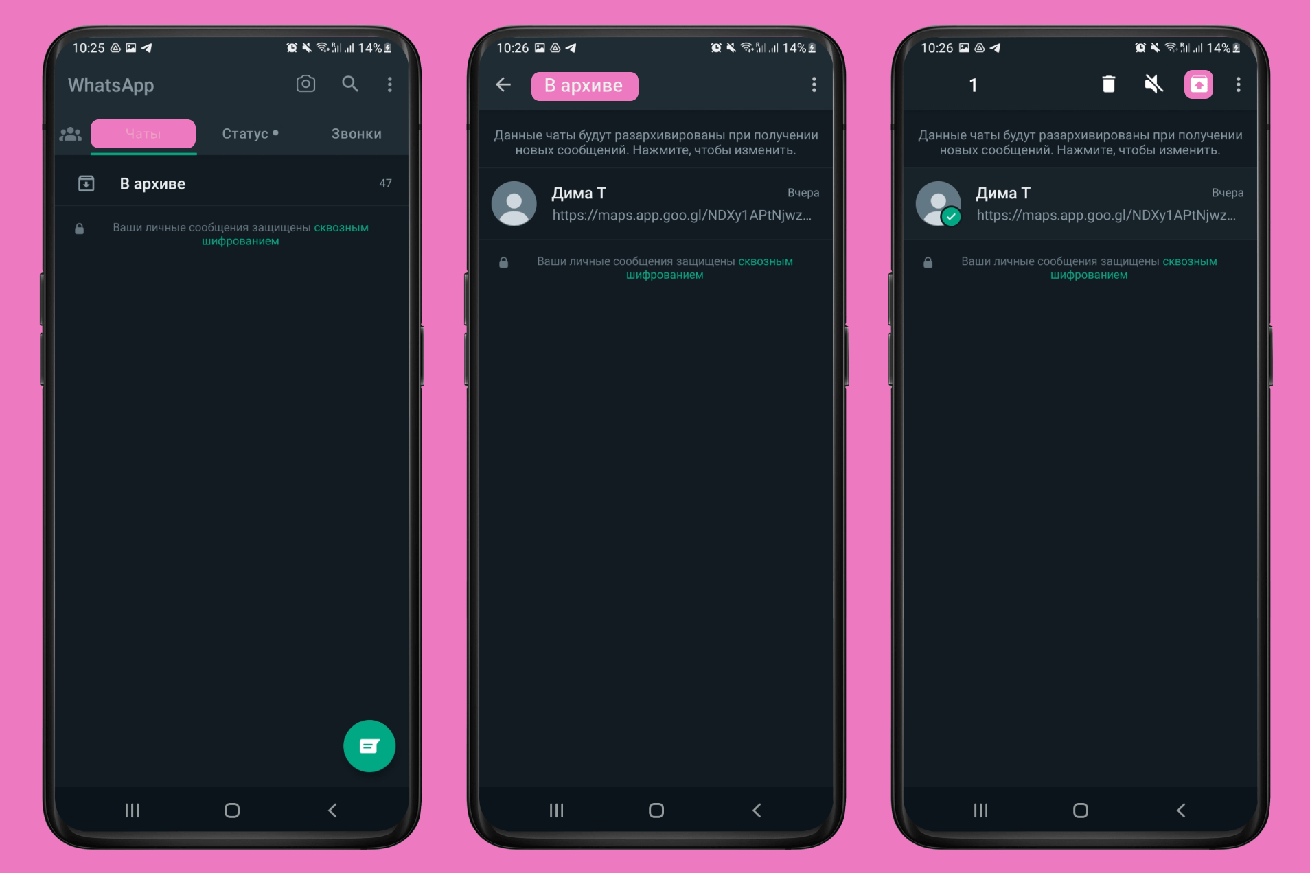 Чтобы достать чат из «Архива», действуйте поэтапно: