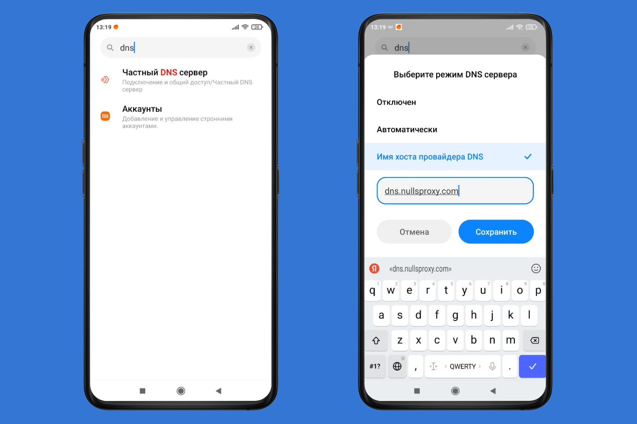 - Впишите dns.nullsproxy.com