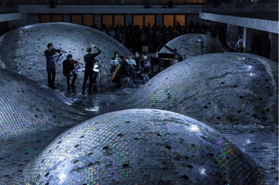 Еще одна работа, про которую мы хотим вам рассказать, — это инсталляция 2012 года канадского скульптора Ан Те Лиу под названием White Dwarf (Белый карлик). Огромная сфера, подвешенная в пустом пространстве, состоит из множества устаревших электронных приборов. Название и форма работы берут начало от остатков мертвых звезд.