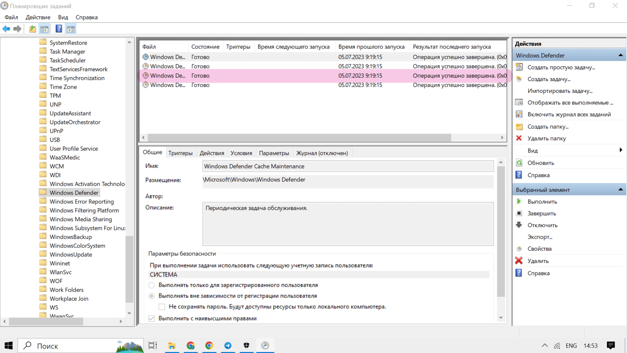 После того, как зайдете в планировщик, разверните каталог библиотеки в левой части экрана. Там есть папка Microsoft, а в ней — Windows. Далее щелкаем по Windows Defender — в центре экрана появится список из четырех пунктов. Найдите среди них Windows Defender Scheduled Scan и два раза кликните по нему.