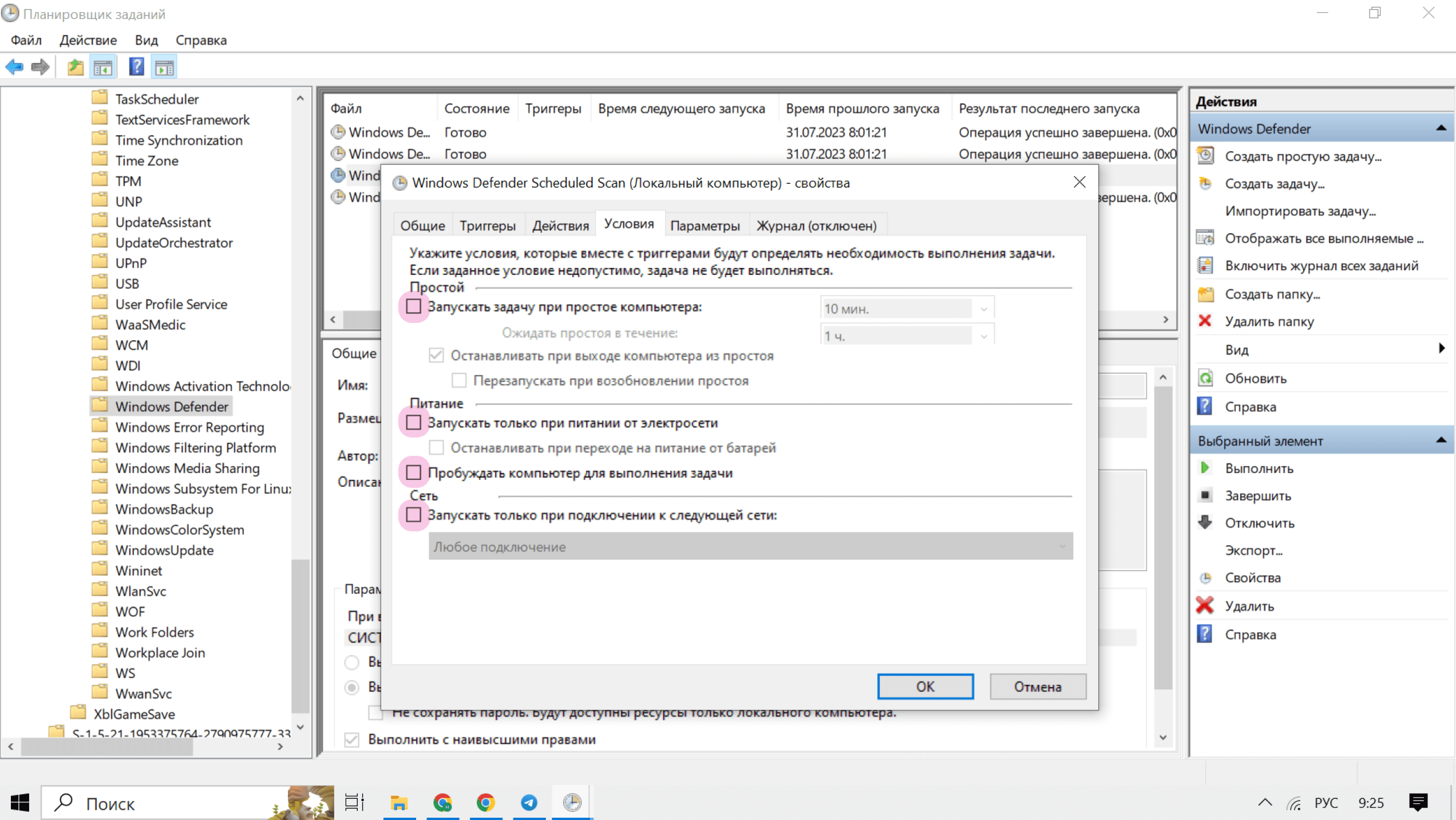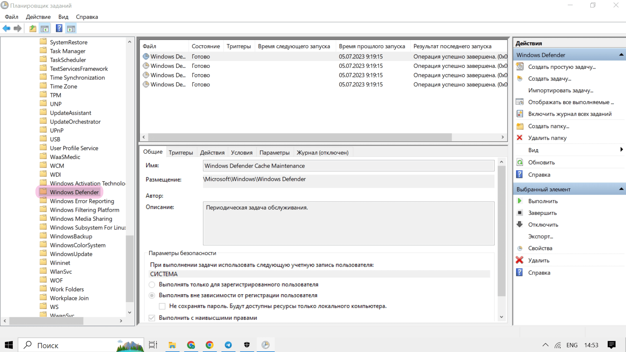 Чтобы окончательно решить проблему, нам снова понадобится планировщик. Слева находим раздел Microsoft, в нем — Windows, а далее — Windows Defender.
