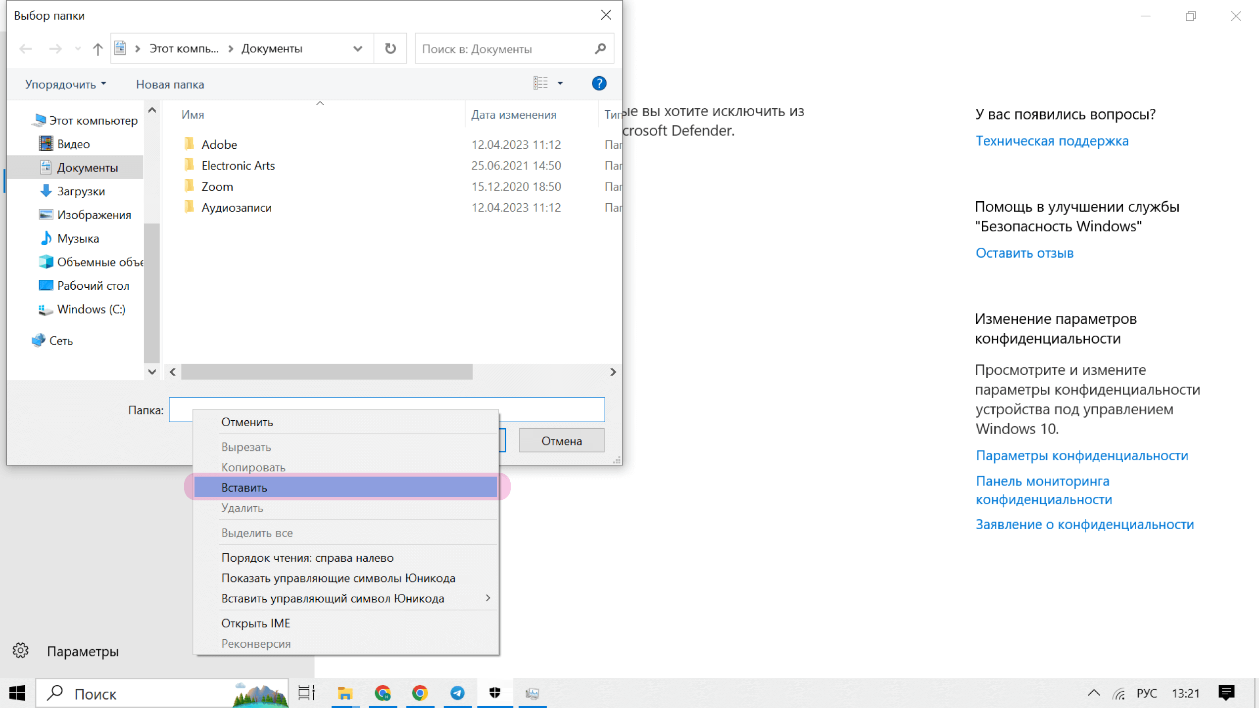 Щелкаем по функции «Добавить исключения», а затем выбираем тип «Папка». Далее вставляем скопированный ранее адрес и подтверждаем действие кнопкой «Выбор папки». Больше Antimalware Service Executable не будет проверять сам себя.
