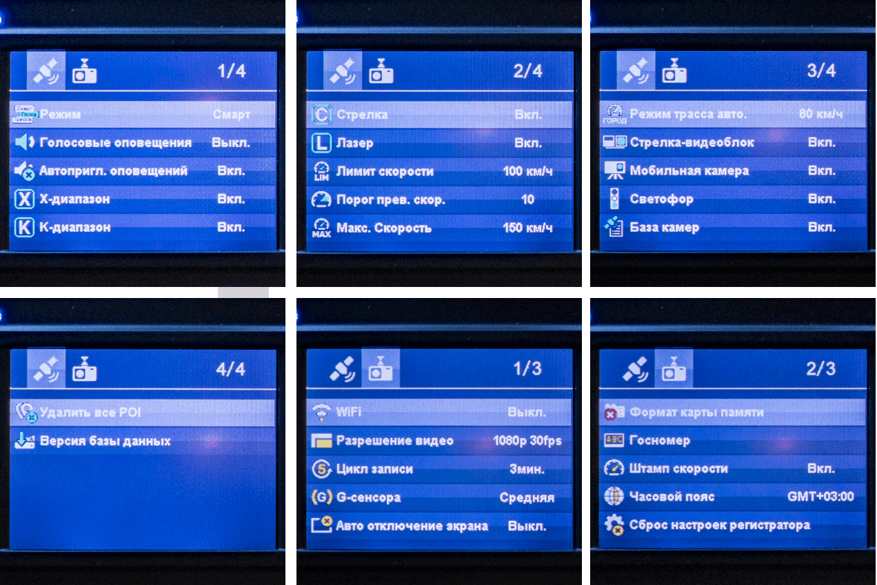 В меню можно настроить качество записи, длительность роликов, чувствительность радар-детектора, оповещения о превышении скорости на выбранный предел, показ на видео скорости и госномера, можно (и даже нужно) отформатировать в устройстве новую флешку, чтобы запись видео шла без проблем. Назначение физических кнопок не так интуитивно понятно, как управление через сенсорный экран, но и к настройкам вам вряд ли придется часто обращаться.