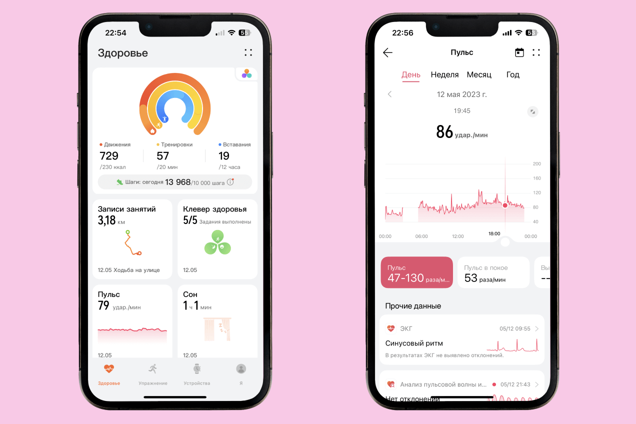 Связь со смартфоном реализована при помощи фирменного приложения Huawei Health («Huawei Здоровье»), которое доступно для Android и iOS. Главный экран у всех подобных программ устроен по одному и тому же принципу — на него выводятся показатели физической активности и состояния пользователя. Отображение тех или иных показателей можно настроить под себя — убрать лишнее или, наоборот, выбрать что-то из доступного, но скрытого по умолчанию. Разобраться с приложением можно за считаные минуты, но надо обязательно упомянуть одну особенность — чтобы начать проводить некоторые измерения (например ЭКГ или оценку артериальной жесткости), сначала требуется включить эту функцию именно в приложении смартфона, дав ему соответствующие разрешения.