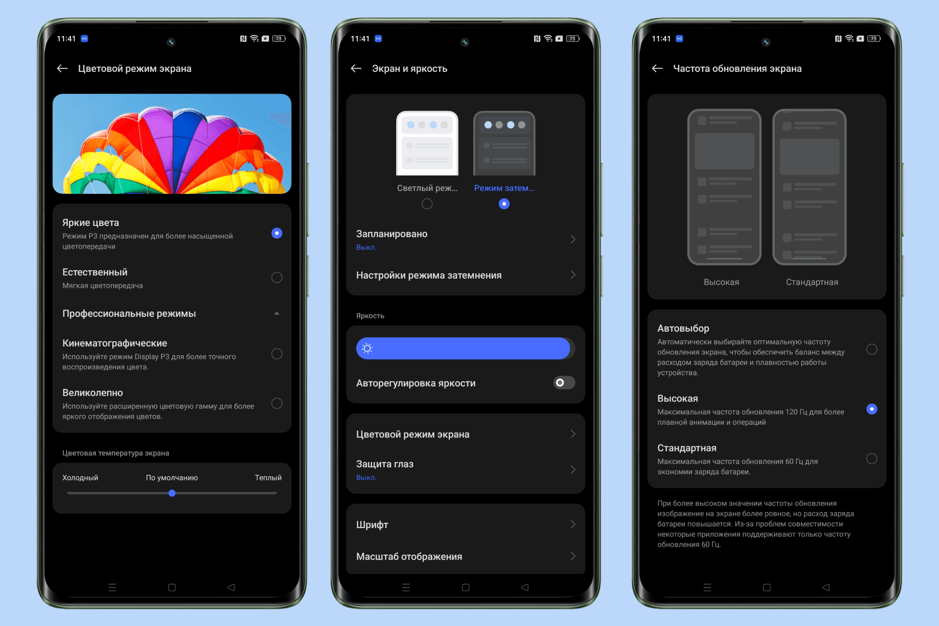 В настройках экрана можно выбрать темную тему, настроить включение режима чтения, отрегулировать яркость и цветопередачу, а также изменить масштаб интерфейса и активировать повышенную яркость для просмотра HDR-видео.