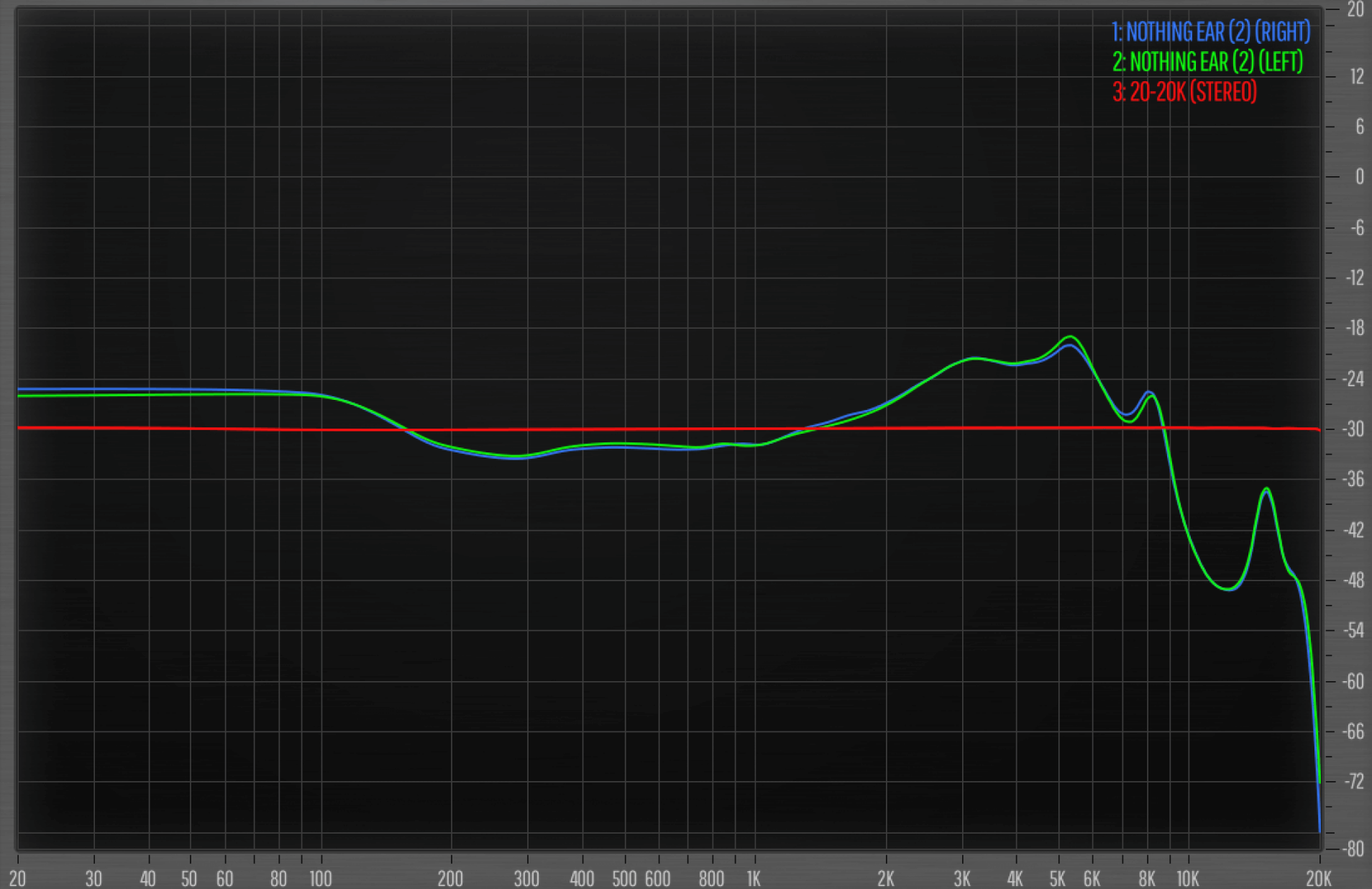 Стоит также отметить отличную калибровку правого и левого наушников (совпадение синей и зеленой линий) — их звучание максимально похоже между собой