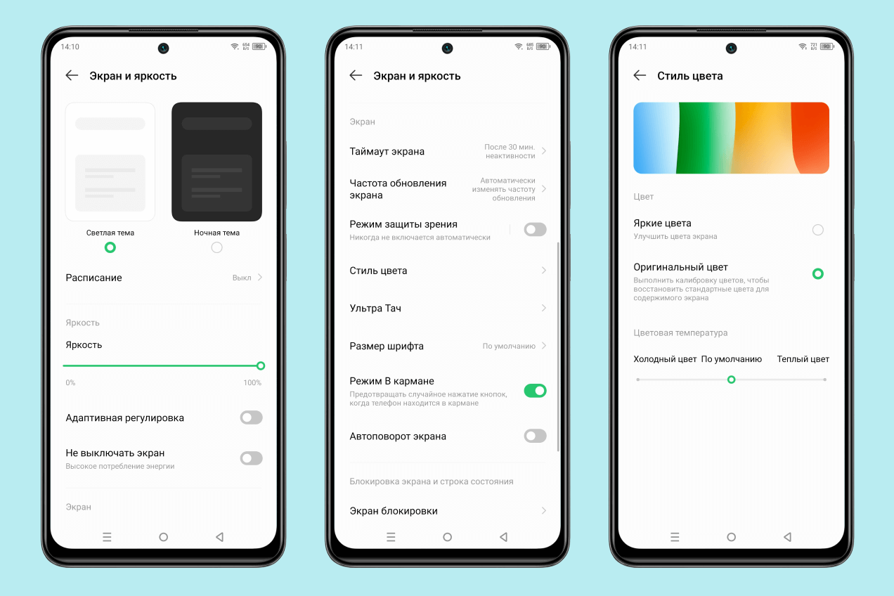 В настройках можно изменить цветопередачу, включить специальный режим для чтения, активировать темную тему и изменить масштаб интерфейса. Настройки идентичны на обеих моделях.