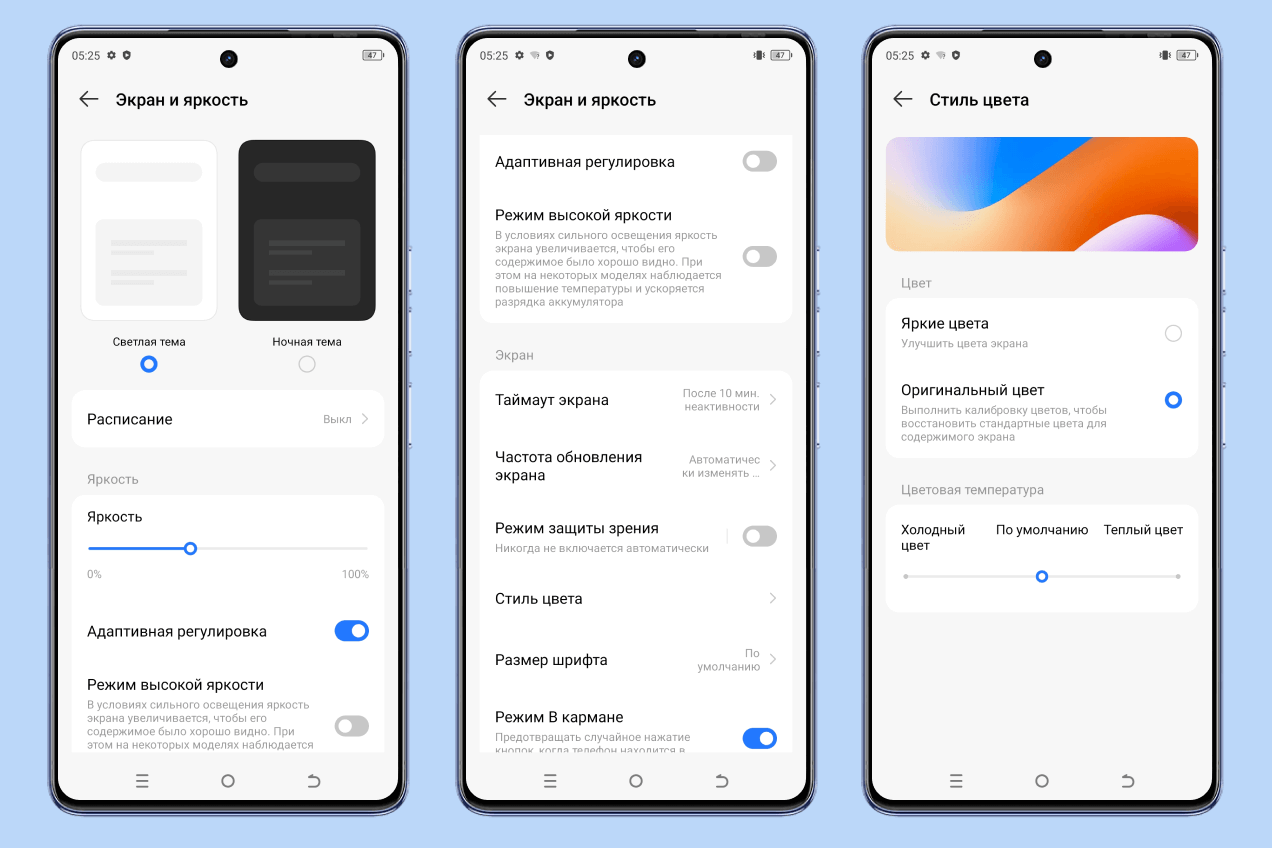 Настройки дисплея радуют своим многообразием. Тут вам и темная тема, и изменение размера шрифта, и специальный режим для чтения, и тонкая настройка цветовой температуры. Можно даже выключить режим 120 Гц, а также активировать режим повышенной яркости.