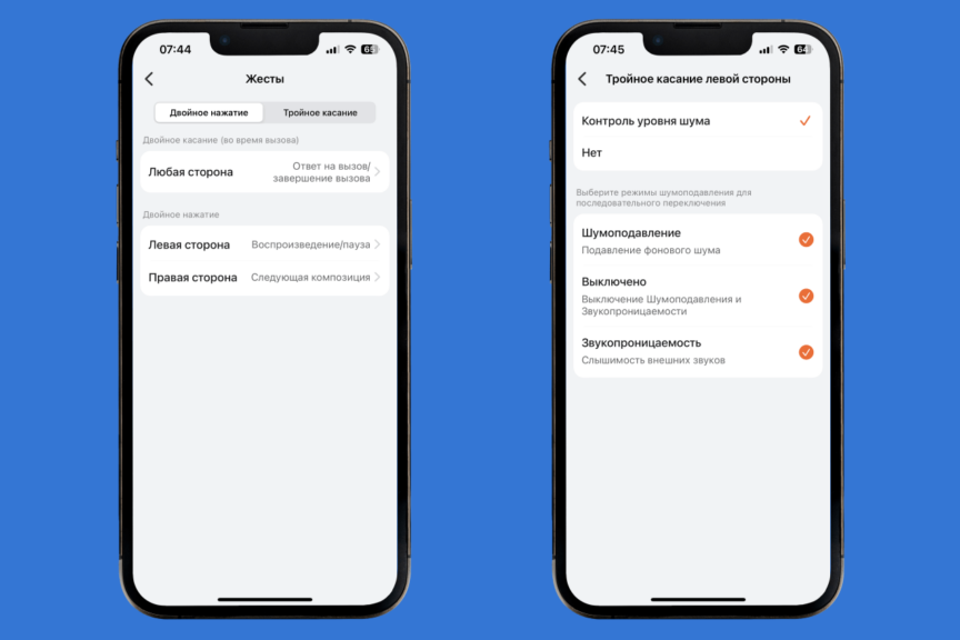 Несмотря на скромные размеры и массу наушников, они обеспечивают не просто хорошее качество звучания, но и несколько полезных функций: активное шумоподавление и управление касаниями пальцем уха. Все верно — двойное и тройное касание пальцем определенного места ушной раковины запускает действие, которое настраивается в приложении на смартфоне (ответ на вызов или его завершение, приостановить/продолжить воспроизведение медиаконтента, переключить трек и другие).
