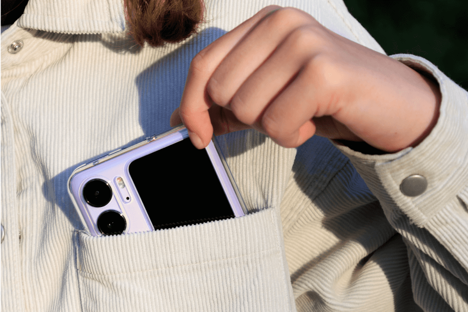 Когда смартфоны только появлялись, они были существенно меньше современных моделей. Однако удобство работы с большим экраном быстро взяло верх, и то, что раньше с долей иронии называли «лопатой» или «фаблетом», стало рядовым современным телефоном. Пользоваться комфортно, а вот носить с собой — не всегда. Не во всякий карман помещается. Возможность вдвое уменьшить длину корпуса гаджета кажется ой какой привлекательной! Мы проверили: OPPO Find N2 Flip действительно помещается в любой карман, даже несмотря на большую толщину в сложенном виде.